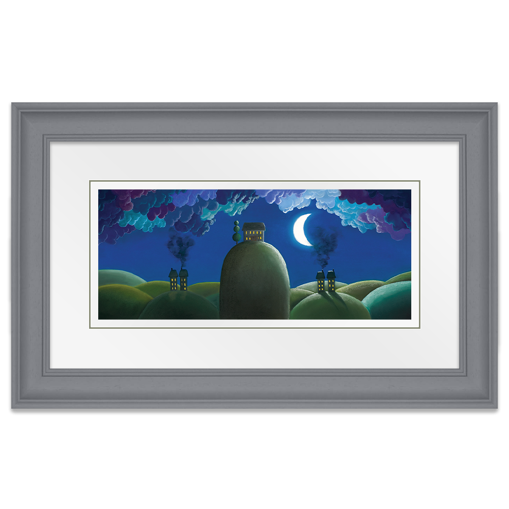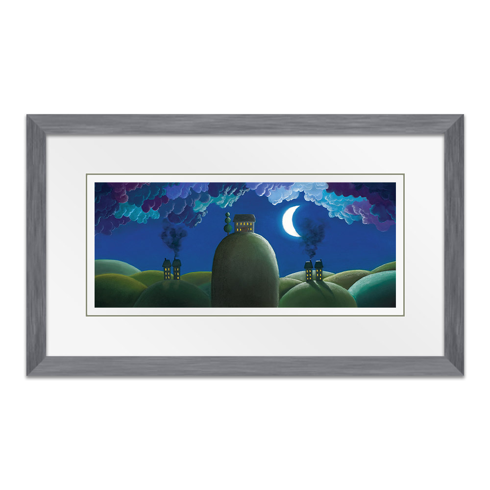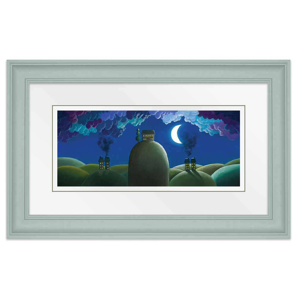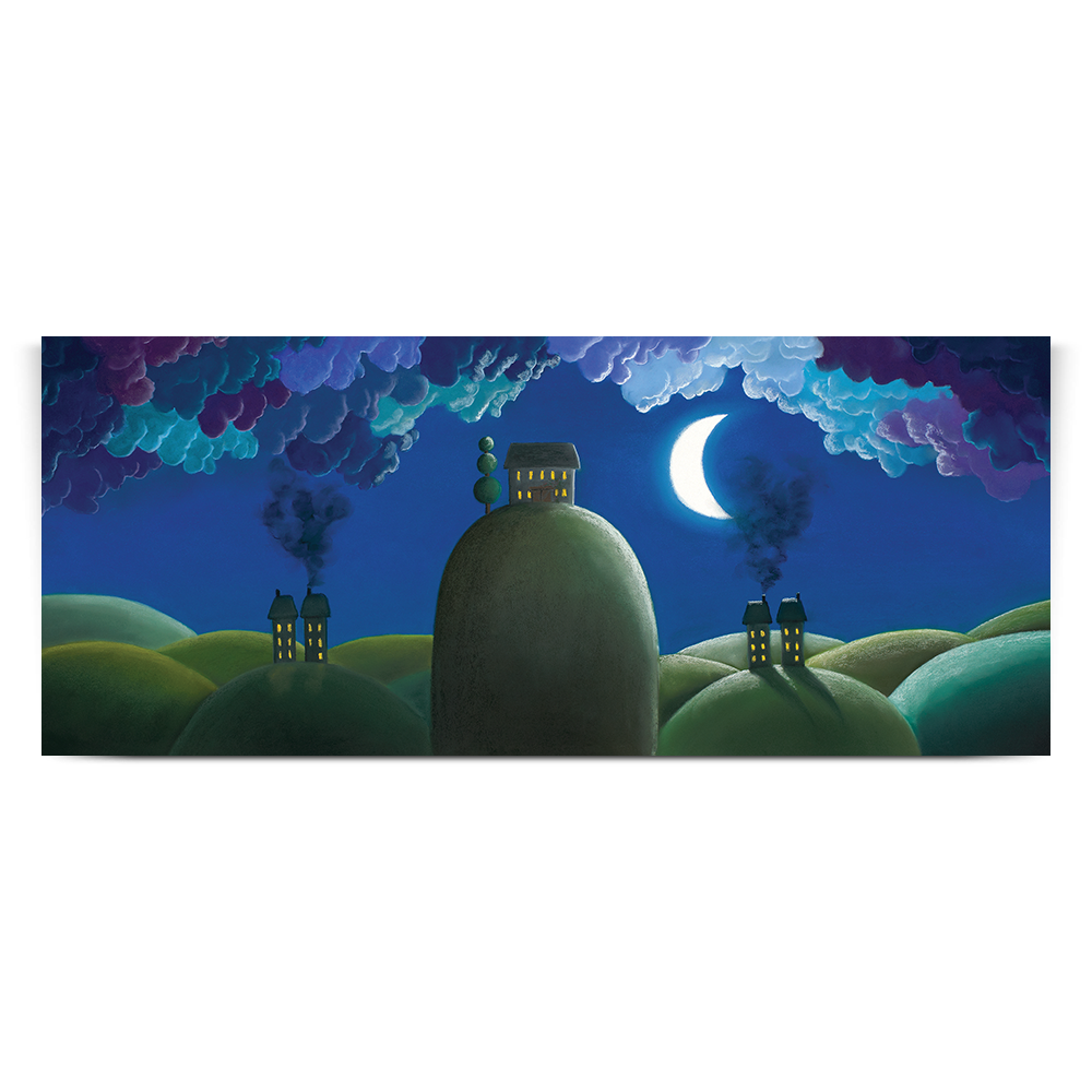 Beside a crescent moon and under a blanket of curly clouds in a night sky, sits a lovely house with a lollipop tree to the side and the warmth of the light inside filters softly outwards. This was the image of where I wanted to be at the time I painted this. I was young, hopeful and had a dream of my future, of living with a loving family, in a big house on a hill with great views. Everybody needs dreams.