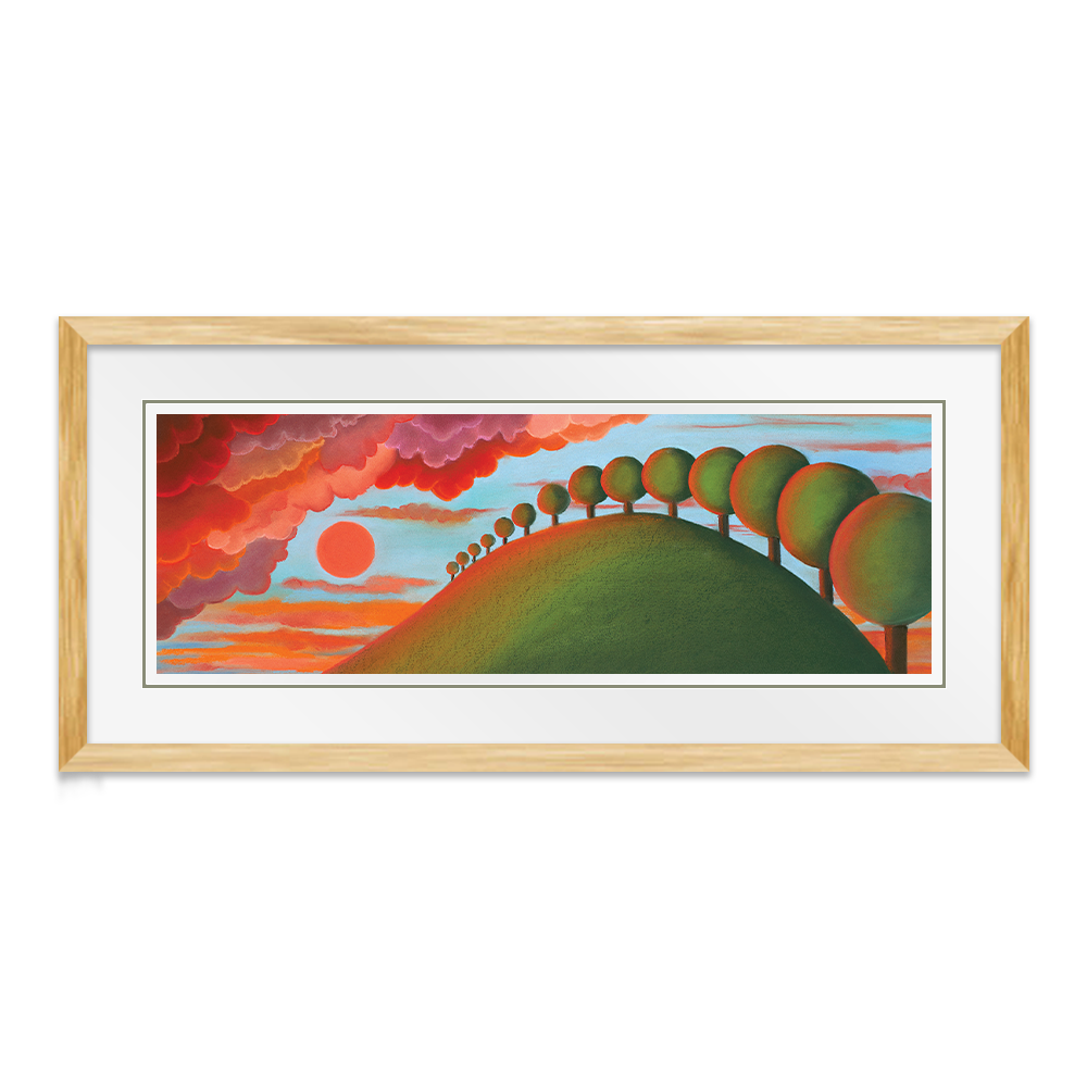 Similar to 'Sunkissed', a contemporary landscape of lollipop trees and curly clouds is kissed by the light from a rich red sun.