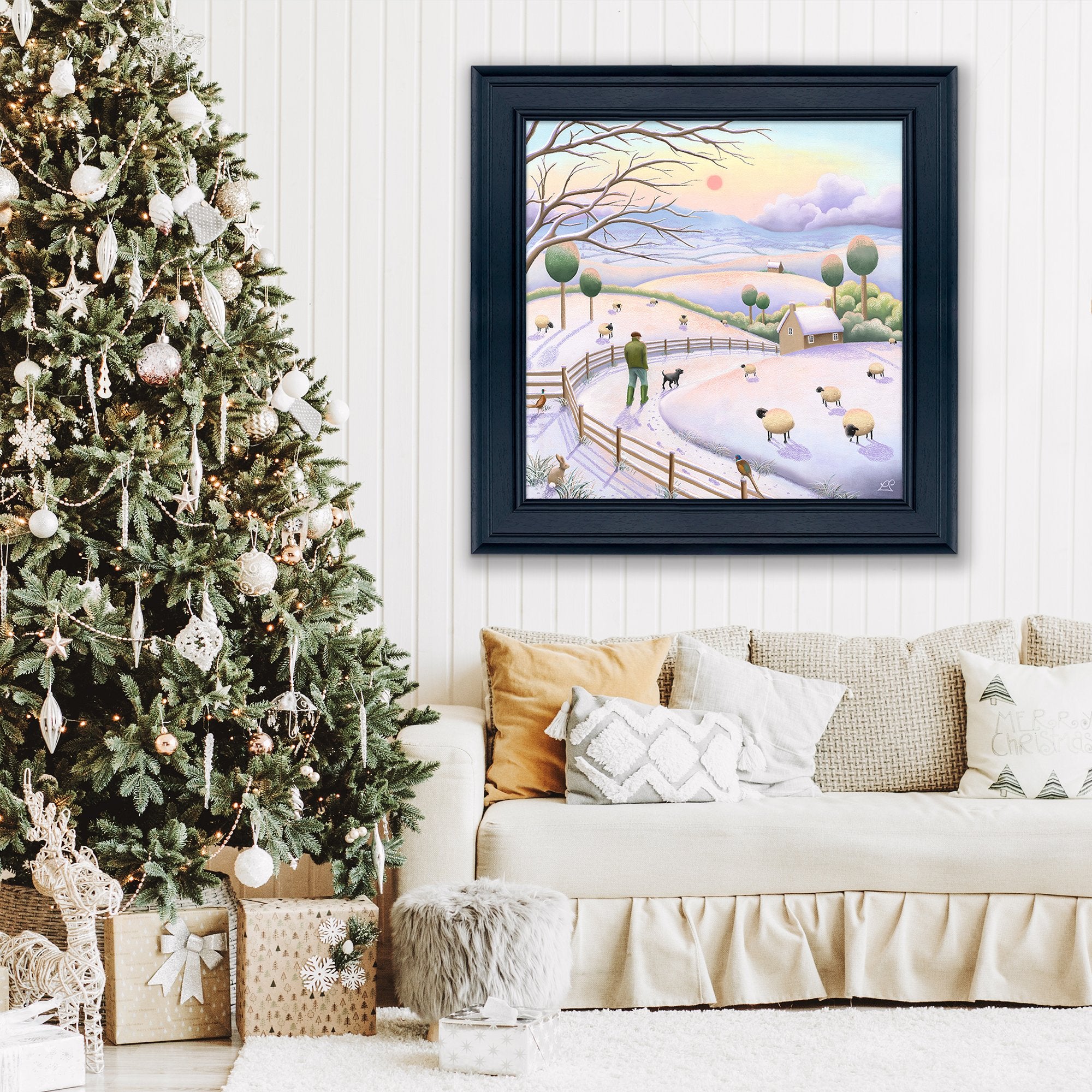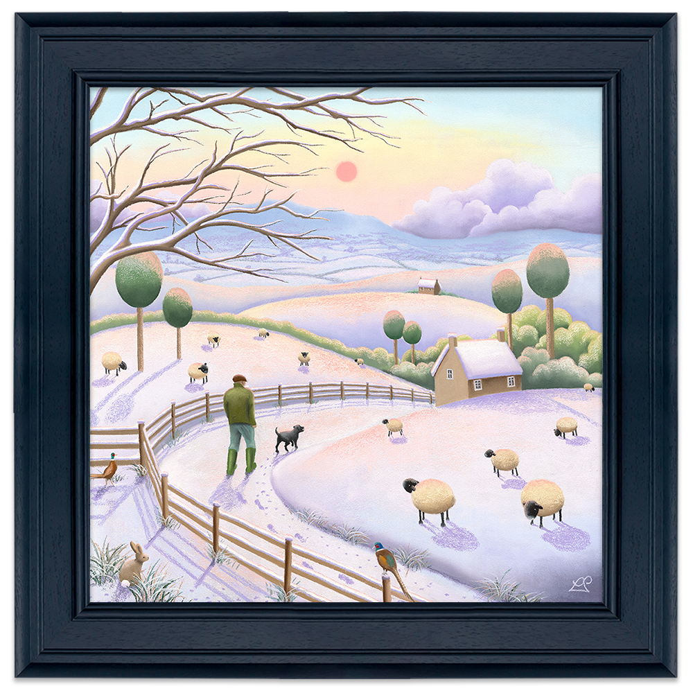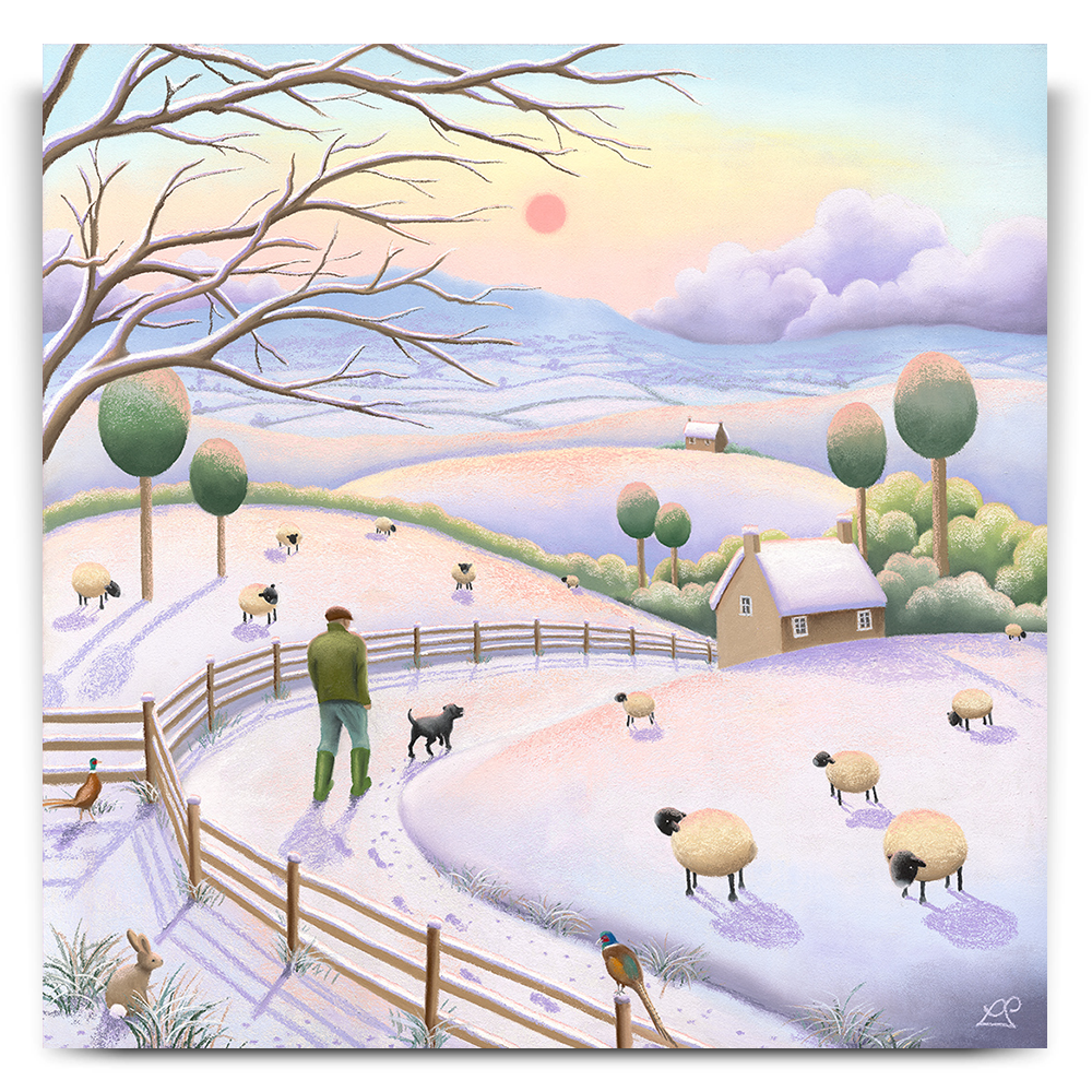 This enticing scene captures a peaceful winter's day in the countryside. A farmer walks with his dog along a snow-covered path, with sheep grazing nearby towards his farmhouse. The soft colours of the landscape and sky give the scene a gentle and tranquil feel, while a cosy cottage sits nestled on a hill in the background. Nature is quietly at play, with pheasants and other wildlife dotted across the scene. It’s a snapshot of rural life during winter.