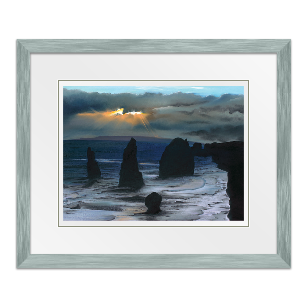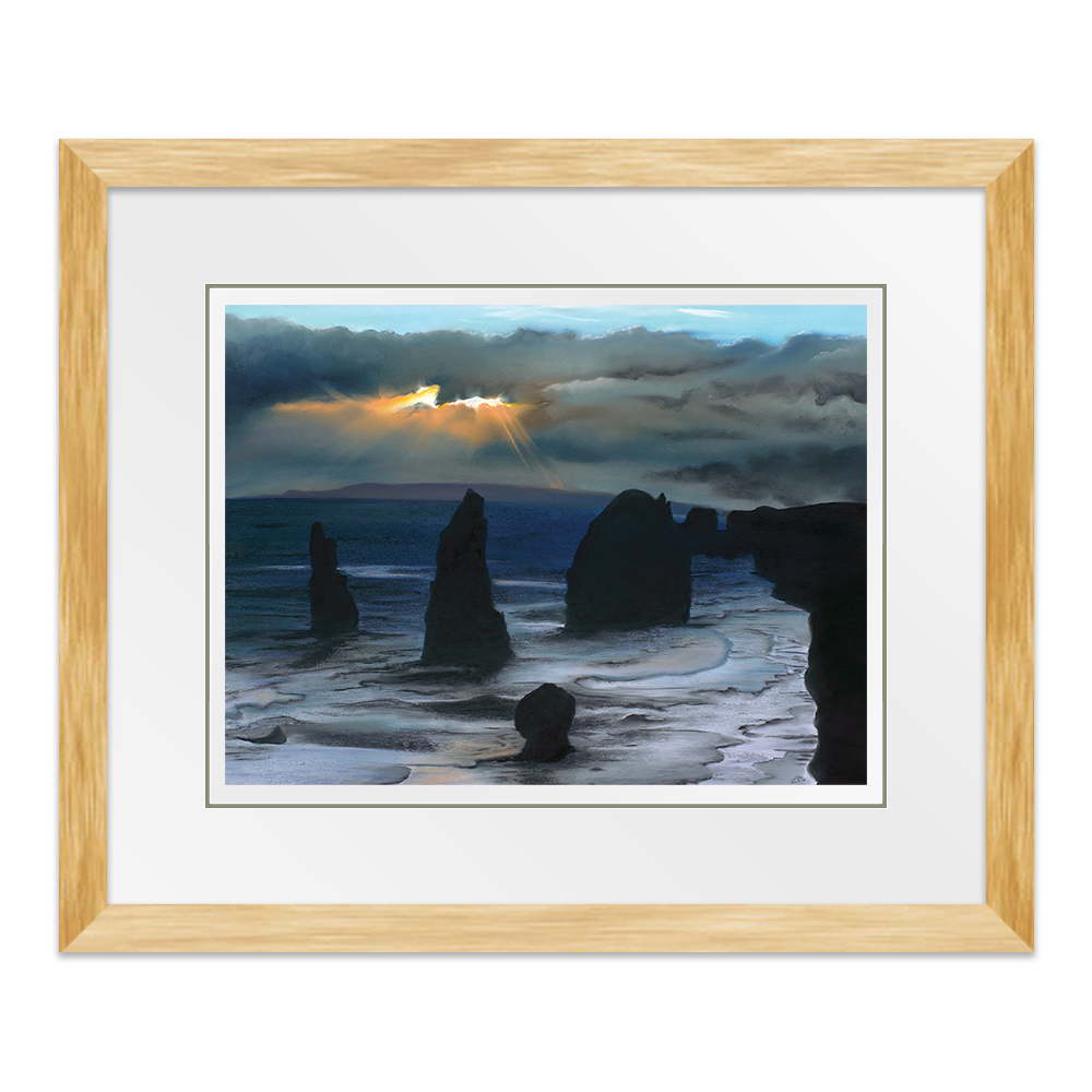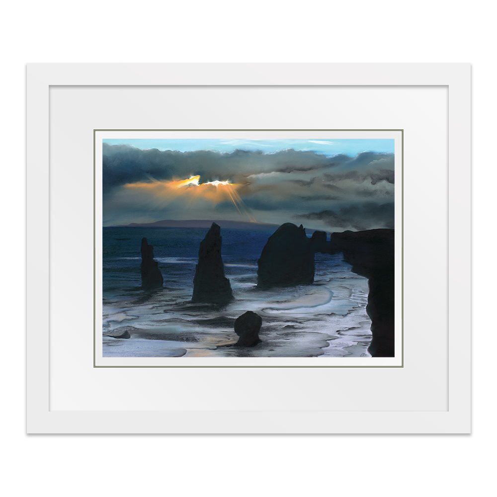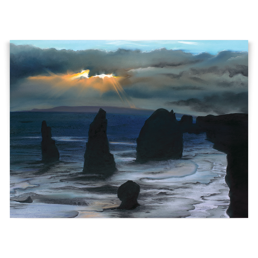 Inspired from my visit to see the Twelve Apostles in Australia, this painting captures the majestic structures protruding from ground, stong and sturdy as they are battered by high winds and waves. In literal terms they are againt the elements but I also feel this perfectly portrays how we can often feel in our lives, as if we are battling the elements and we have no option other than to stand tall and wait for the storm to pass.