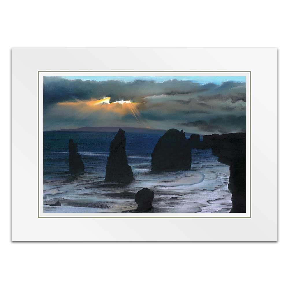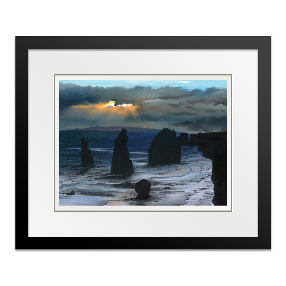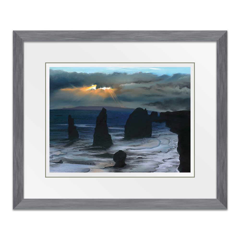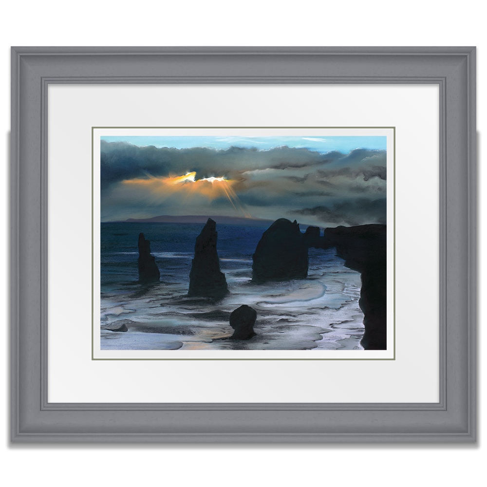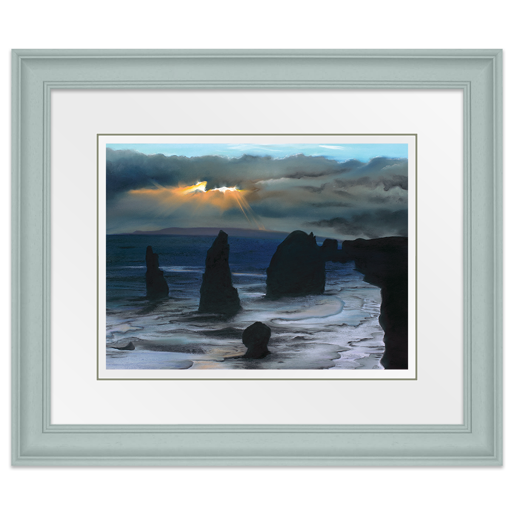 Inspired from my visit to see the Twelve Apostles in Australia, this painting captures the majestic structures protruding from ground, stong and sturdy as they are battered by high winds and waves. In literal terms they are againt the elements but I also feel this perfectly portrays how we can often feel in our lives, as if we are battling the elements and we have no option other than to stand tall and wait for the storm to pass.