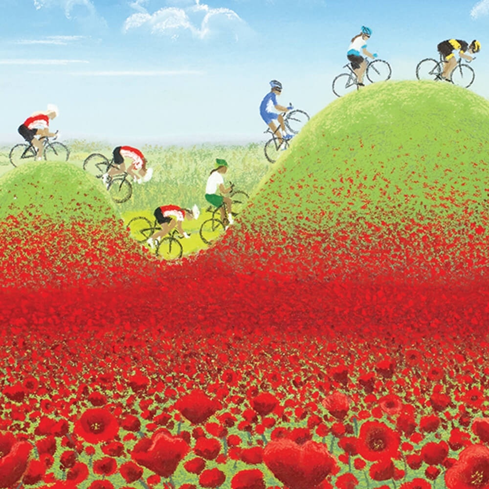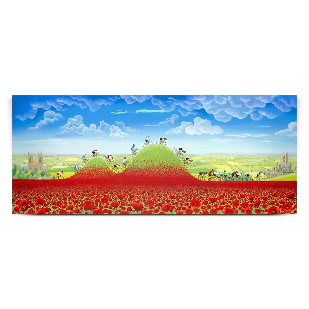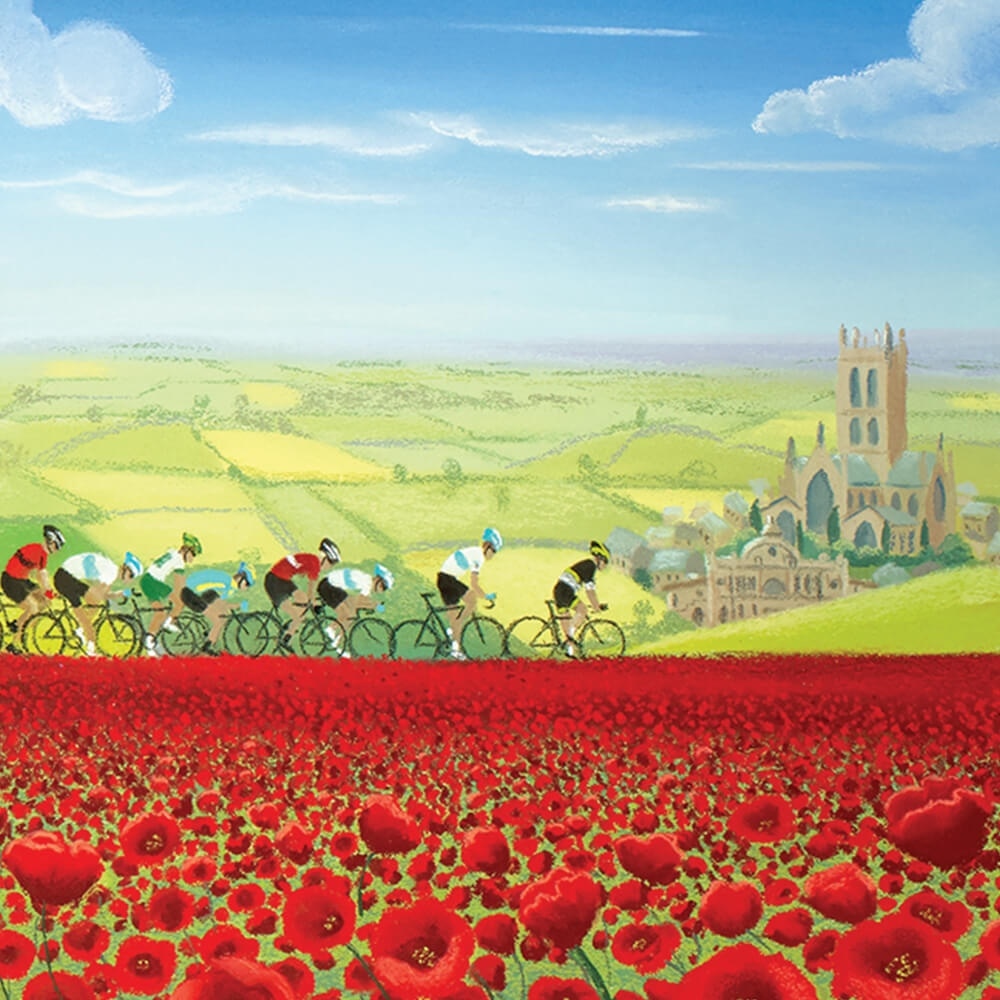 Tour de Yorkshire Art - Official painting of Stage 1 of the 2018 Tour de Yorkshire, depicting the stunning countryside of Yorkshire on the route between Beverley to Doncaster. Featuring Beverly Minster, Doncaster Market hall and Doncaster Minster the cyclists tackle rolling hills, framed by stunning fields of red poppies.