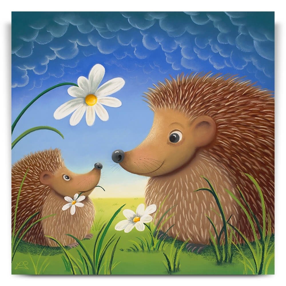 This painting of two hedgehogs shows a baby one holding a daisy in its mouth and offering it as a gift to the adult. Here you can imagine a child presenting a gift to it's Mum, Dad, Grandparent, teacher or just somebody special to them. It's a painting about the giving and receiving of a gift and hopefully the look I have painted on the face of the receiver shows just how little acts of kindness such as these can really mean so much.