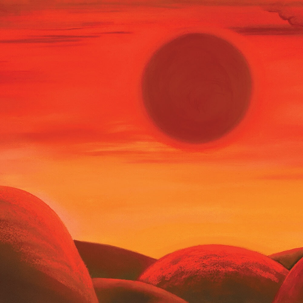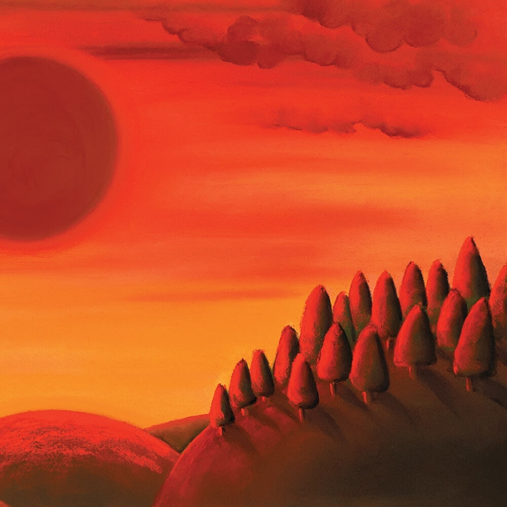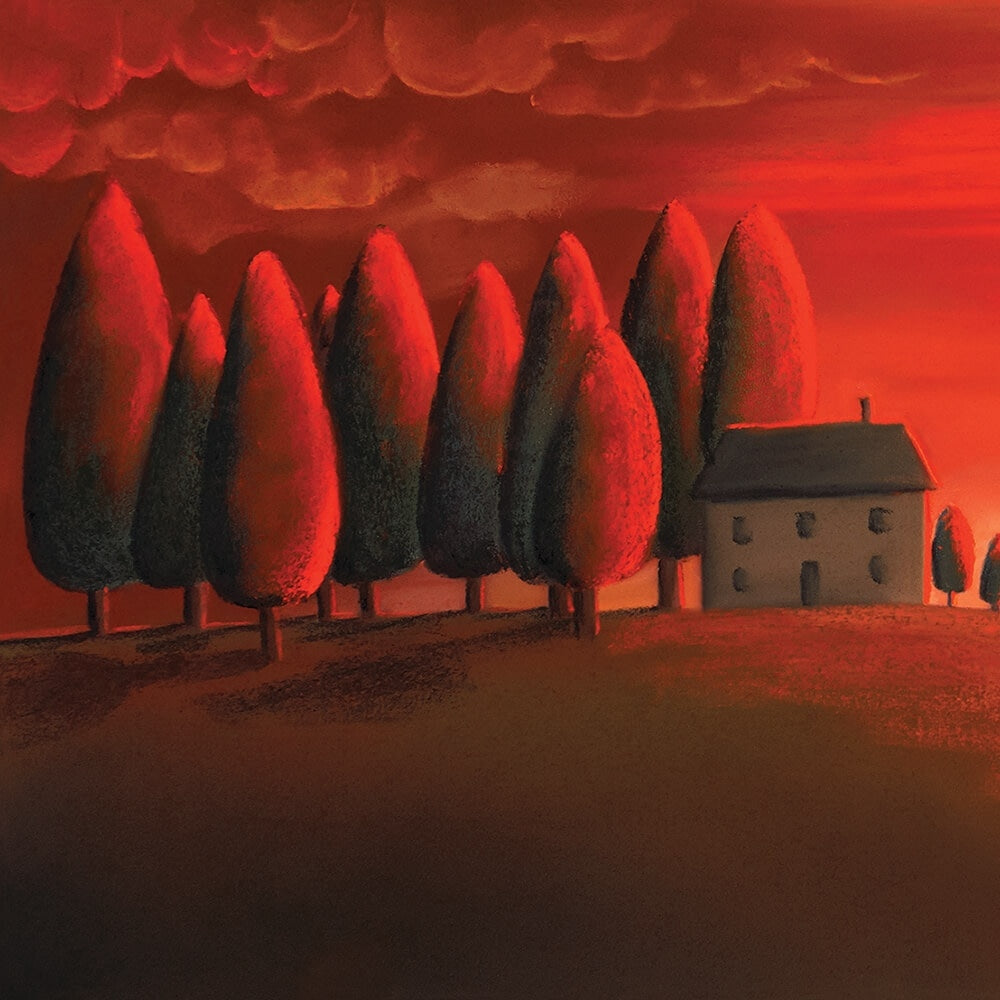 Rich red skies and a molten sun cast a glorious deep red orange light over a simple house and the surrounding landscape, this painting represents our deepest burning desires.