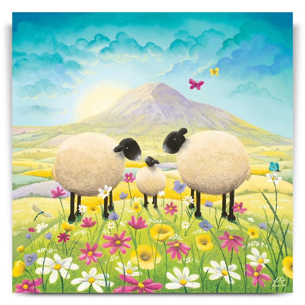 'Butterflies and Babies' is one of my favourite pieces of sheep art that I have created. Inspired by the Cleveland Hills, it features a beautiful summer countryside scene from with delightful pink and yellow flowers, playful butterflies and the innocence of the lamb looking to its parents for reassurance.