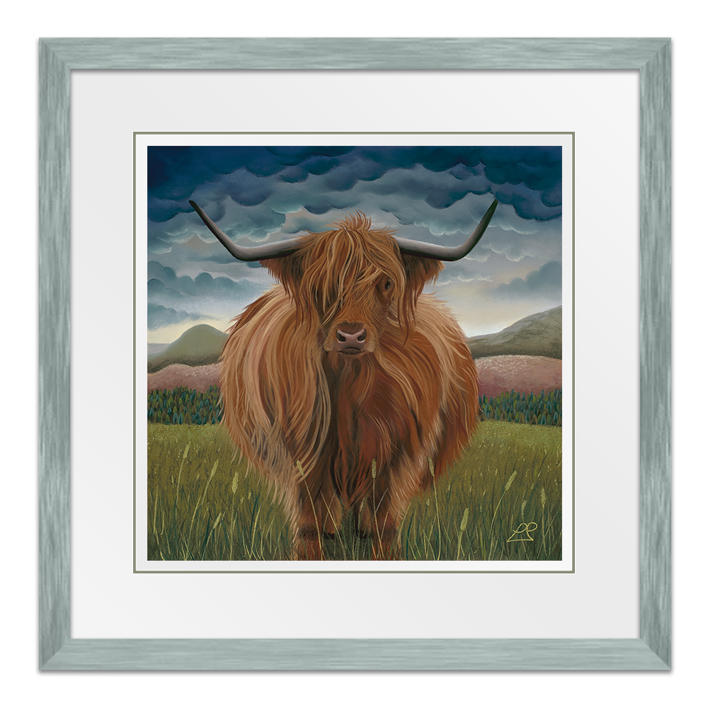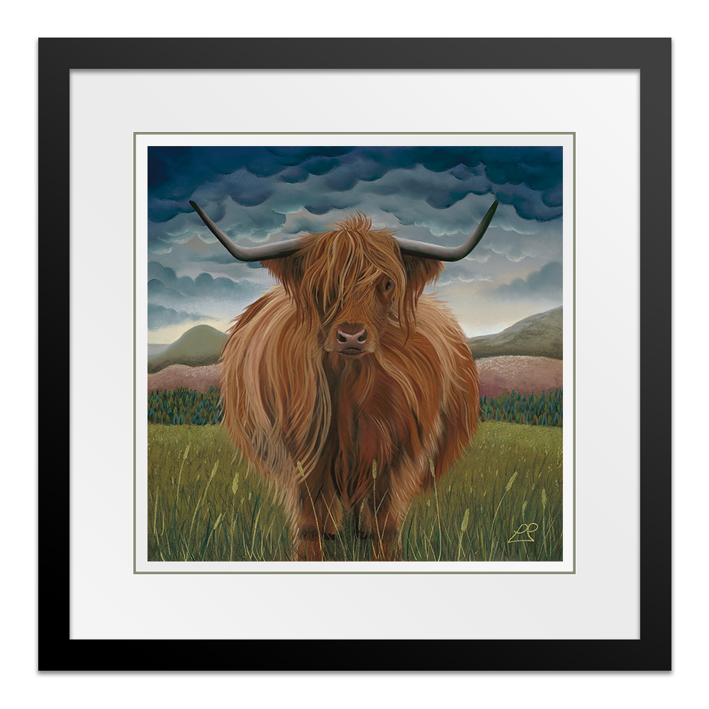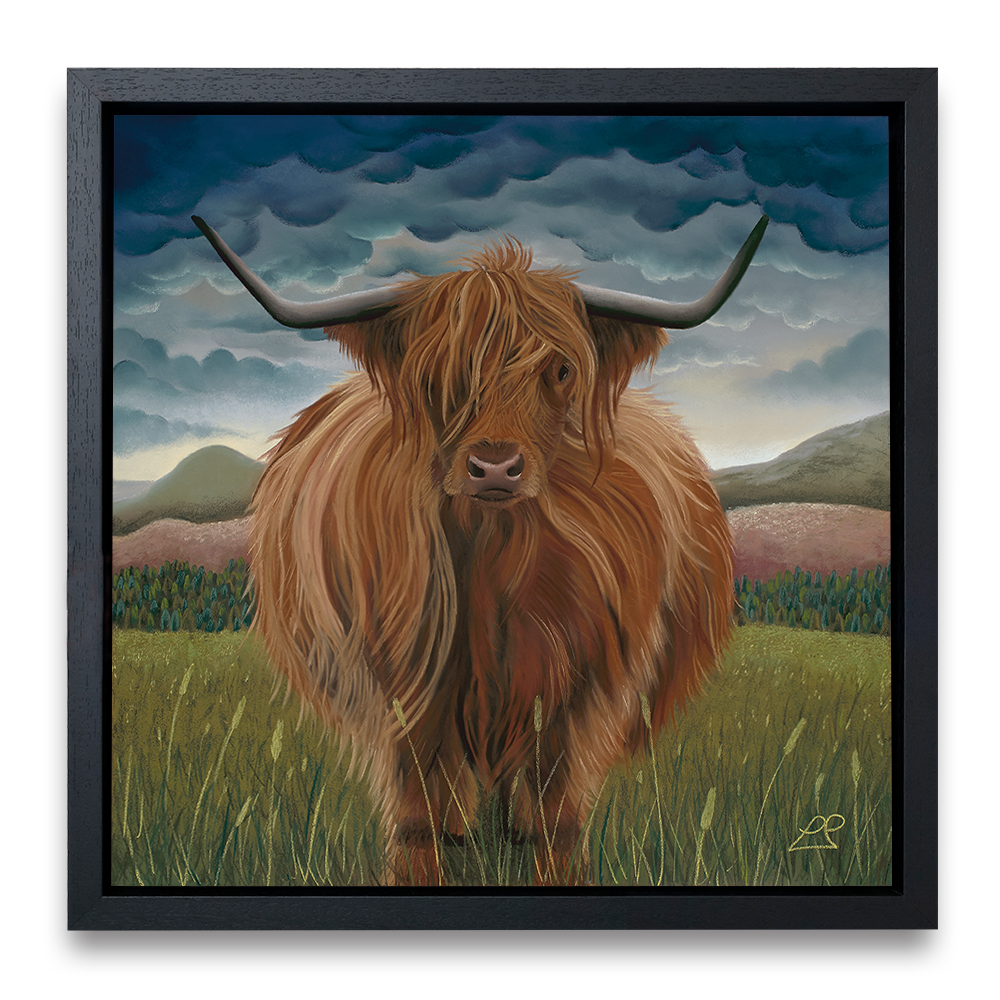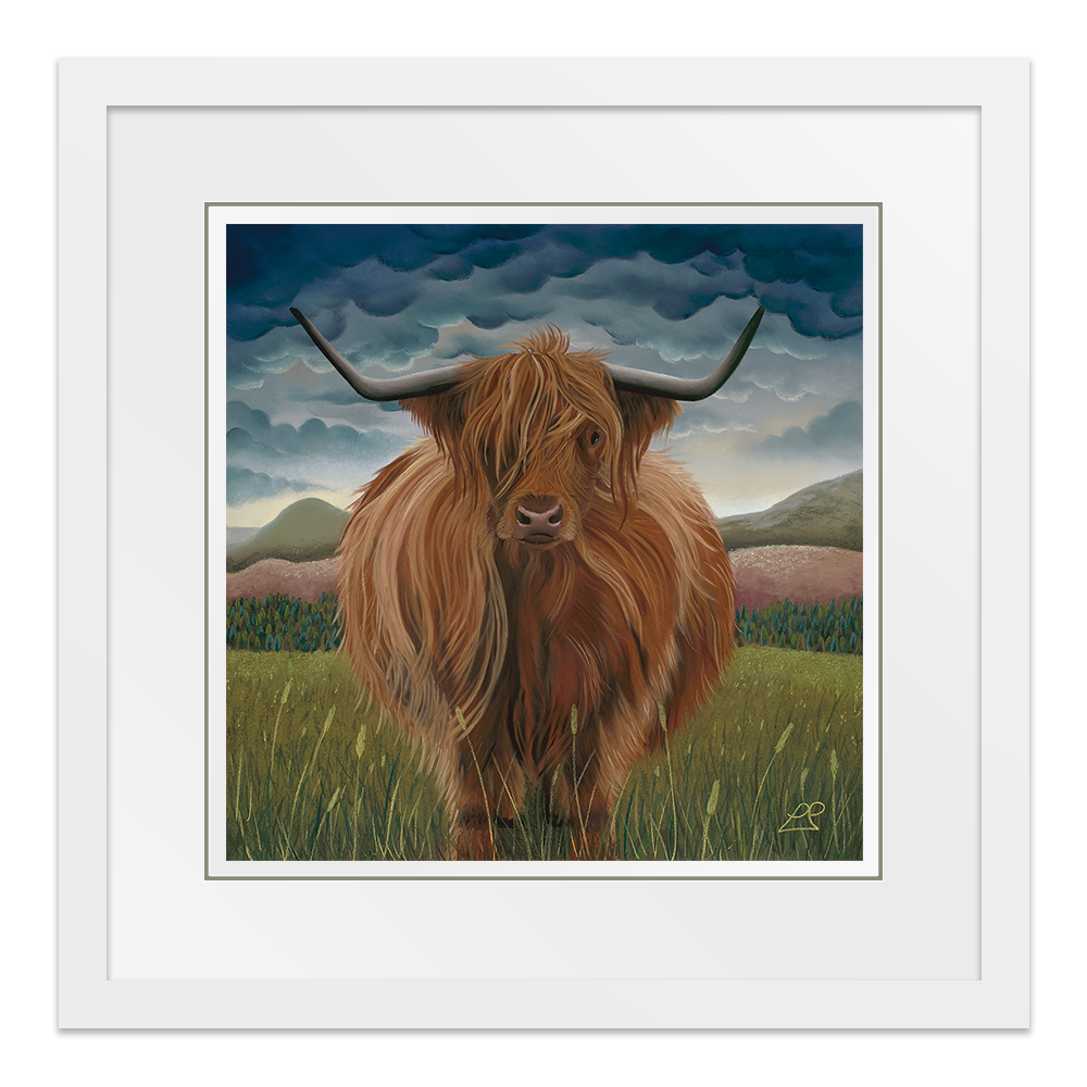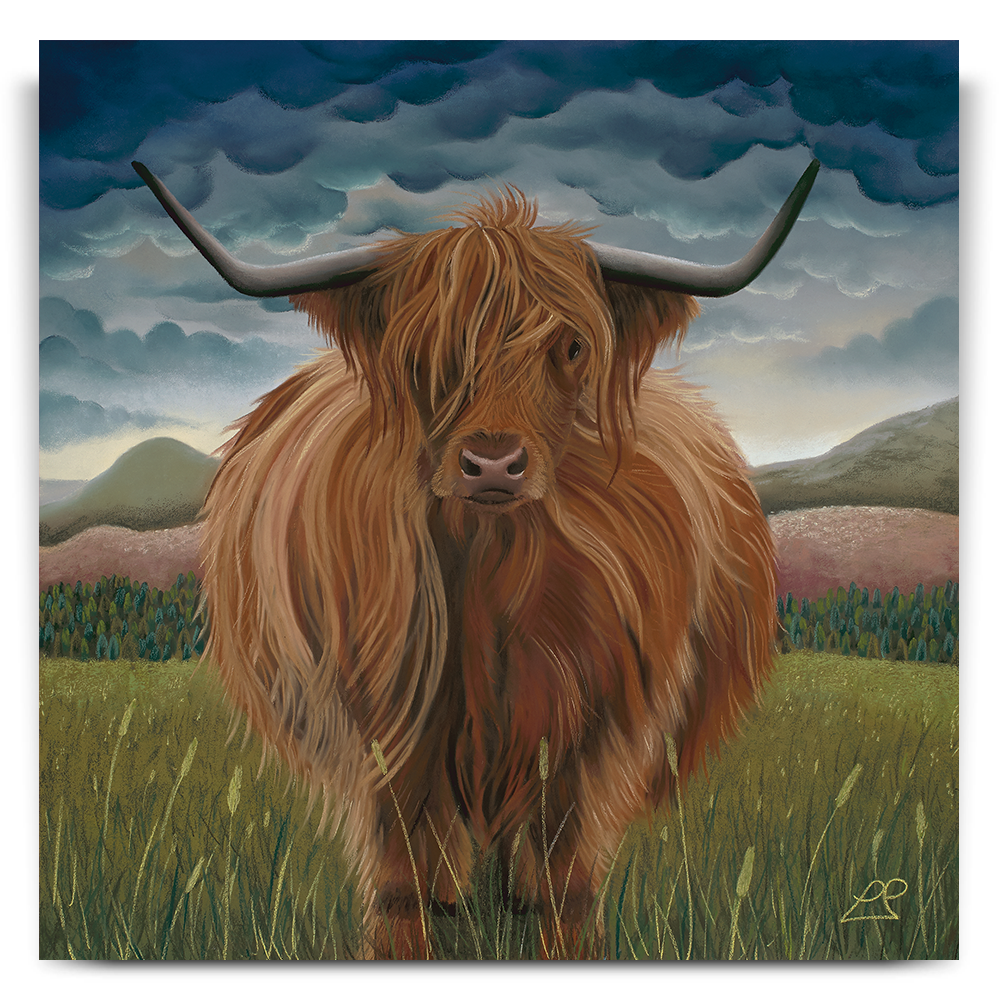 Clarissa was the first Highland Cow I painted. She is soft, yet strong and sits proudly in her landscape of hills, mountains, purple fields and a heavy blue sky.