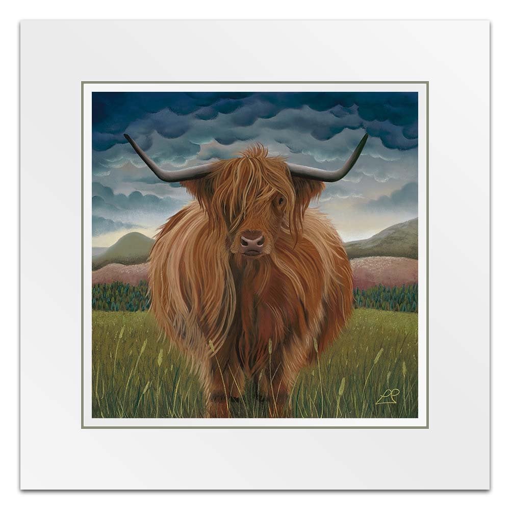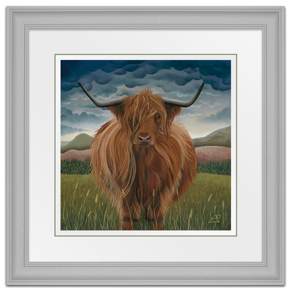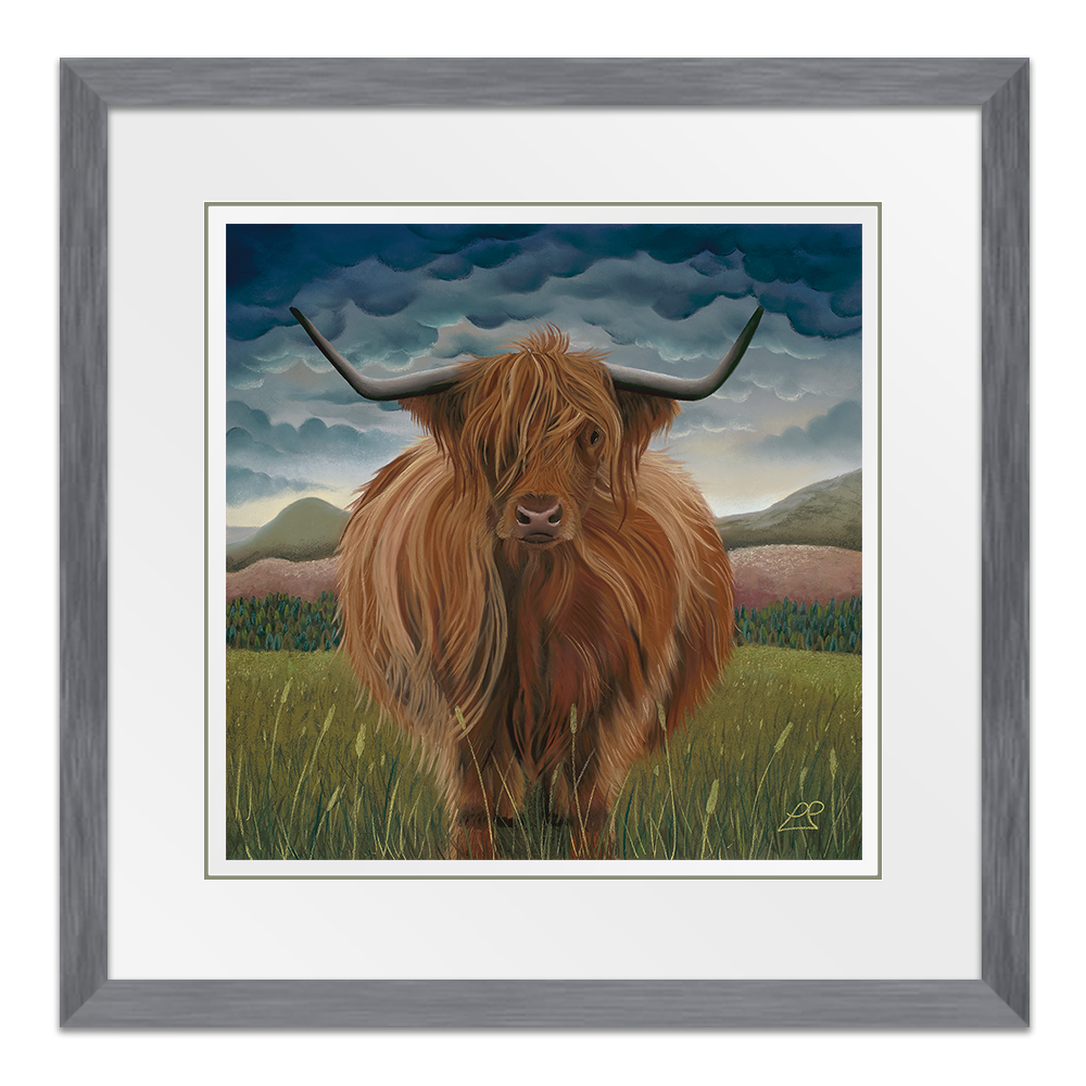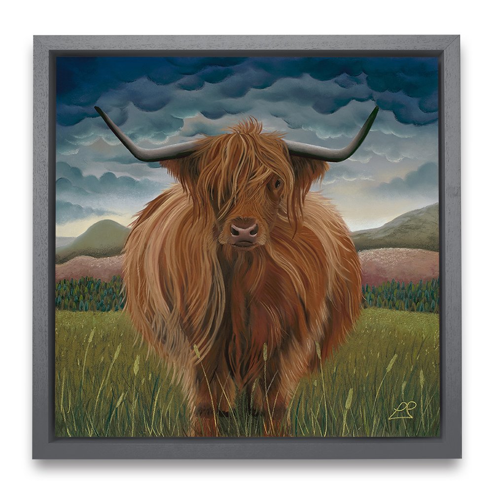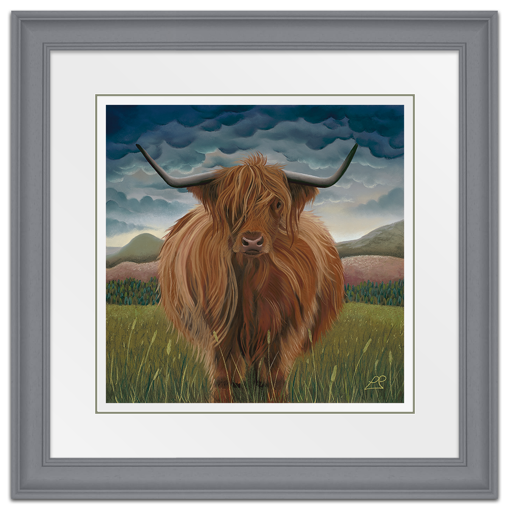Clarissa was the first Highland Cow I painted. She is soft, yet strong and sits proudly in her landscape of hills, mountains, purple fields and a heavy blue sky.