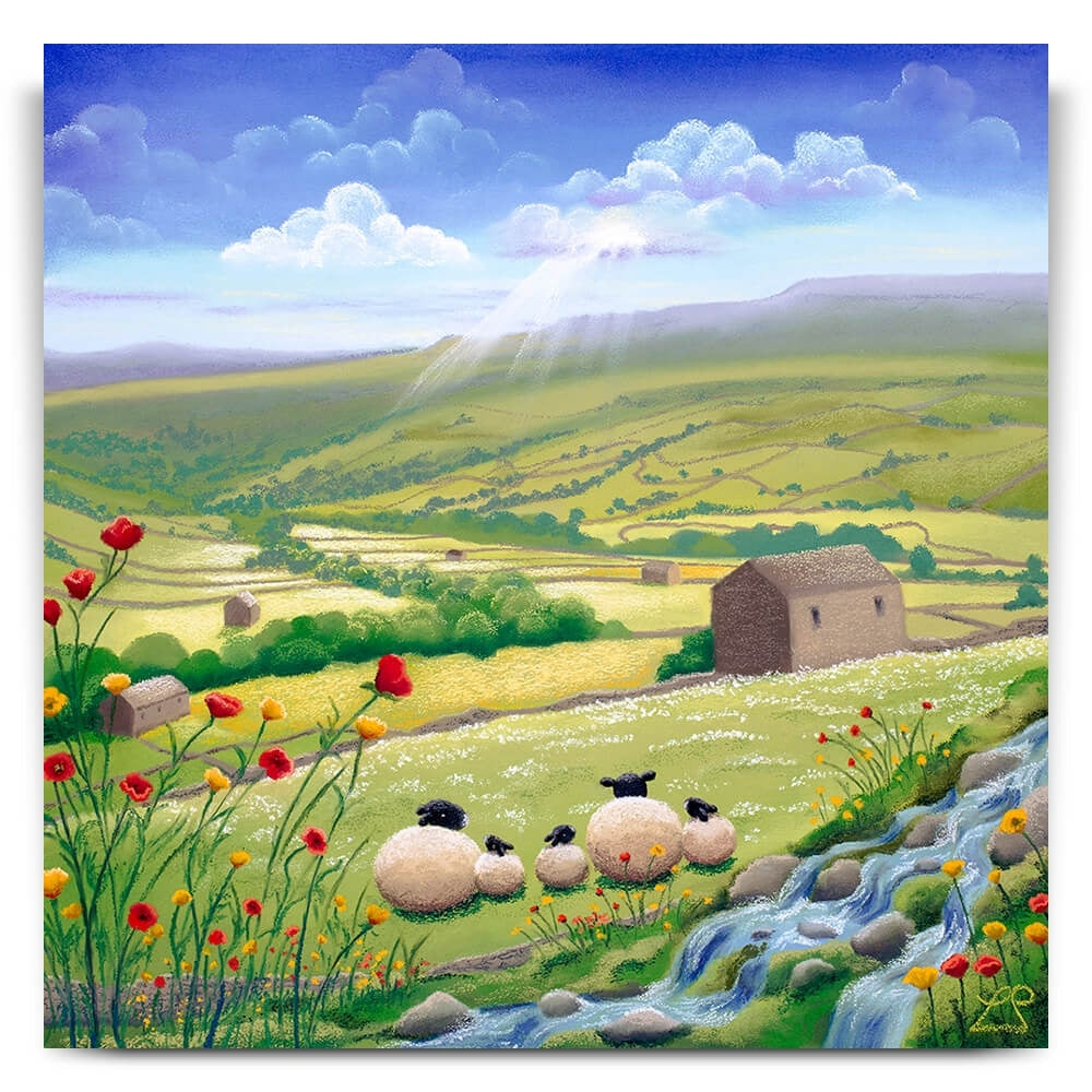 A typical scene in the stunning Yorkshire Dales with its cascading waterfalls and streams, wild flowers, Swaledale Sheep, dry stone walls and stone barns. This setting is brought to life by the sunlight beaming through from the clouds onto the rich pastures below. A peaceful and idyllic setting to drift off to and quieten those busy minds.