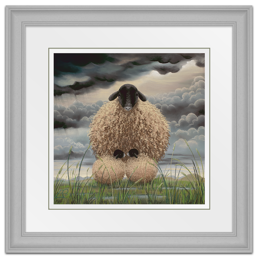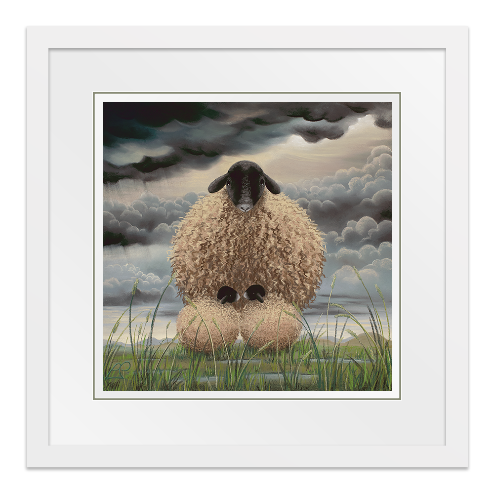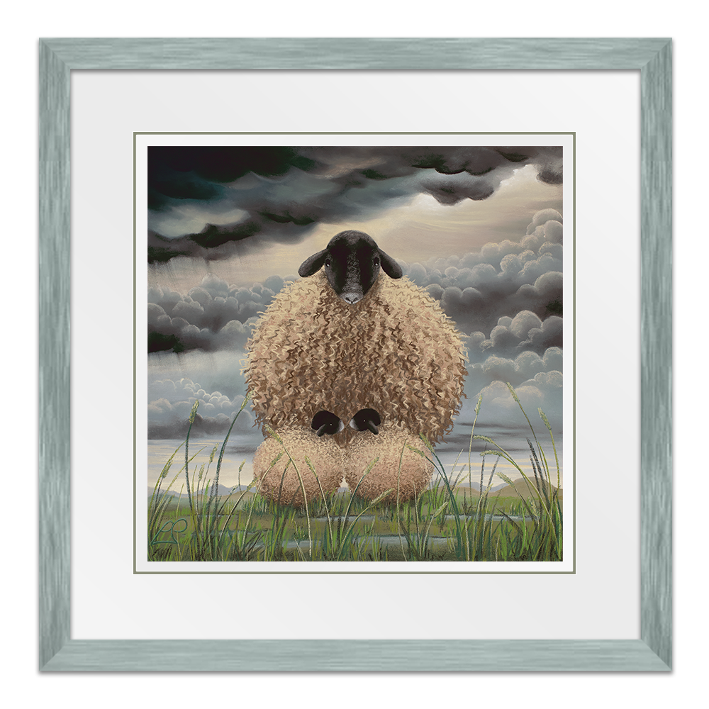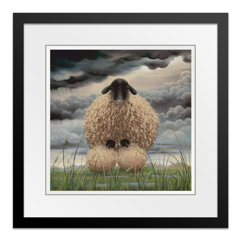 Snuggled into their mother's warm fleece, these two lambs are taking shelter from the elements. The skies are dark and threatening but tucked in close to their mum, they are safe and warm. A ray of light pokes through the heavy clouds, demonstrating that this storm will pass quickly and brighter skies are close by.