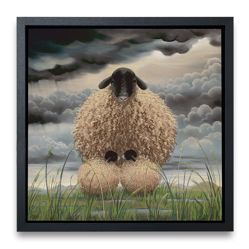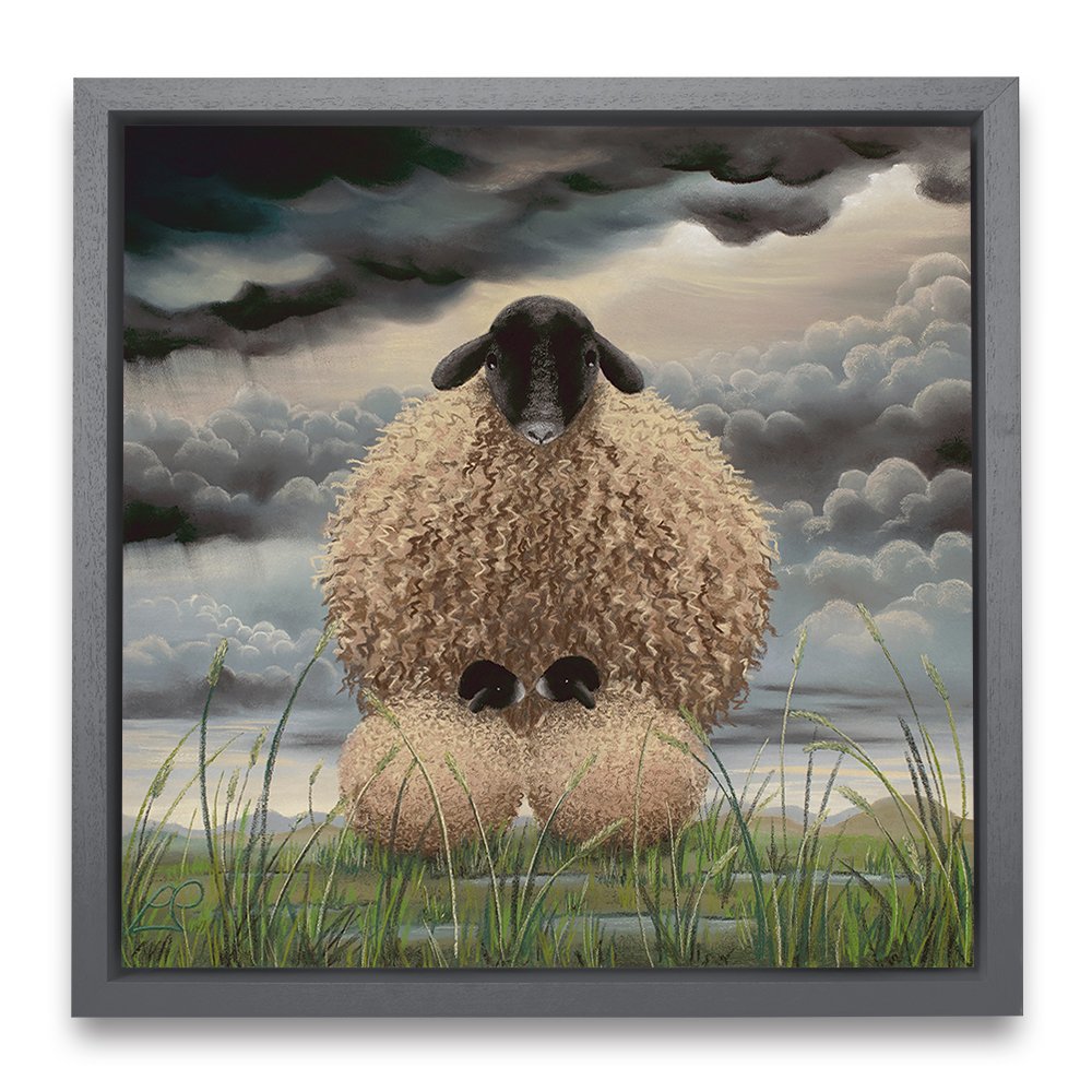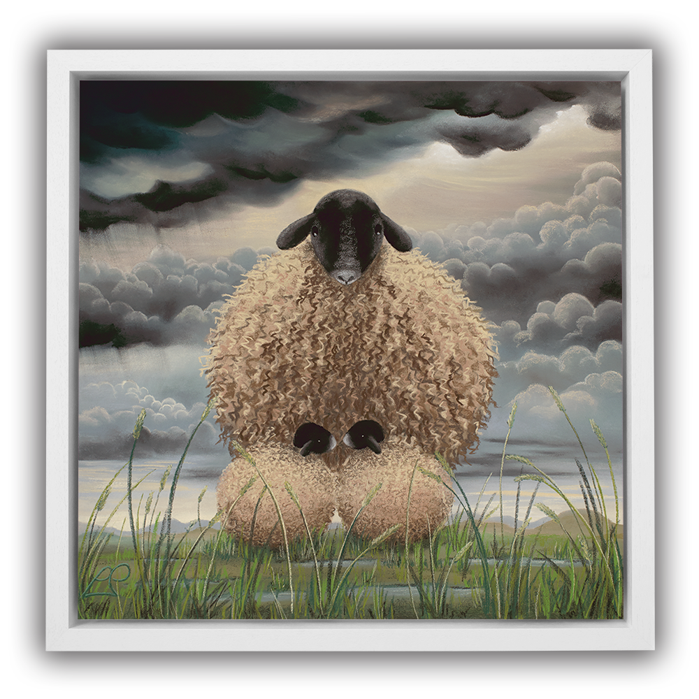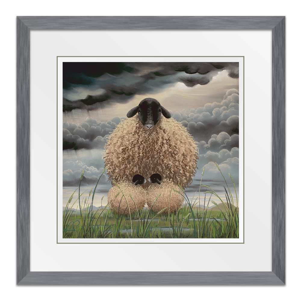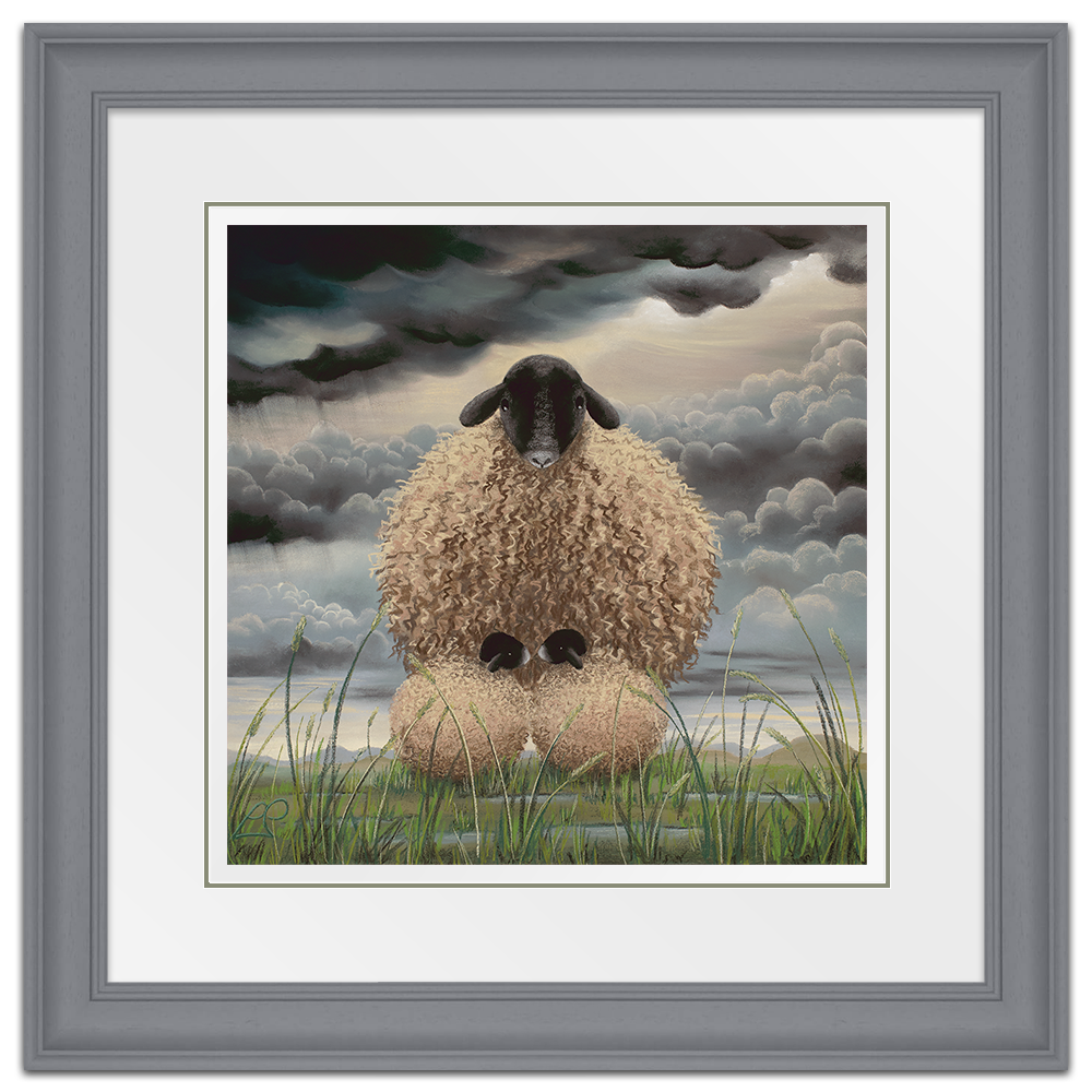Snuggled into their mother's warm fleece, these two lambs are taking shelter from the elements. The skies are dark and threatening but tucked in close to their mum, they are safe and warm. A ray of light pokes through the heavy clouds, demonstrating that this storm will pass quickly and brighter skies are close by.