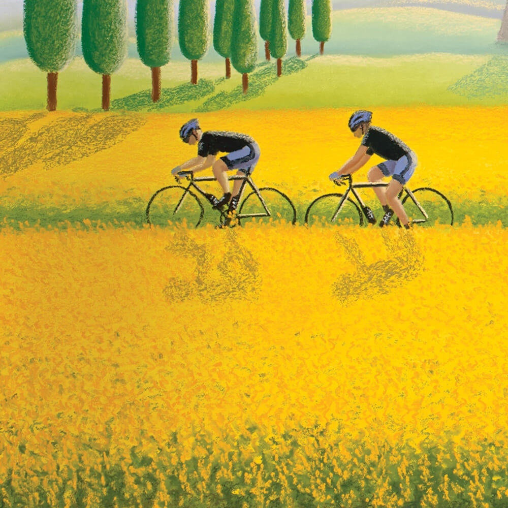 Created as part of the 2017 Tour de Yorkshire cycling collection, Fields Of Gold shows cyclists riding through the colourful golden fields of oil seed rape. In stark contrast to the colourful riders and their countryside, sits the tall grey structures of modern industry, creating a real contrast in the piece.