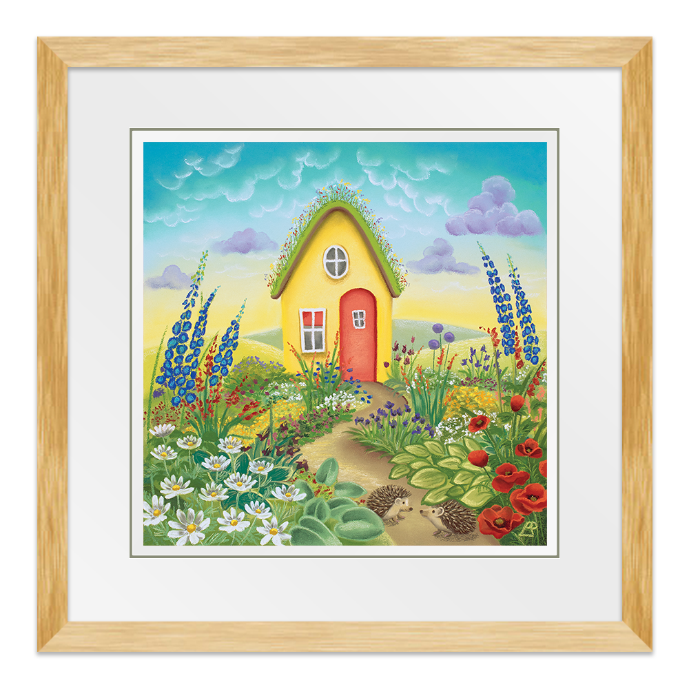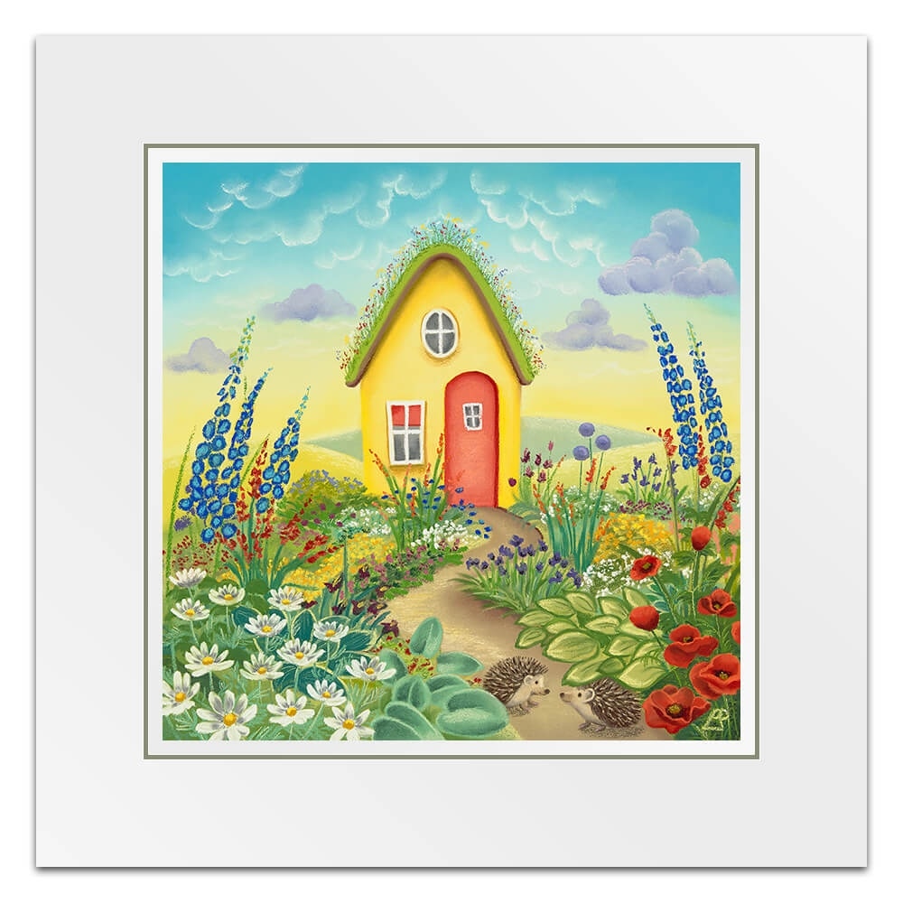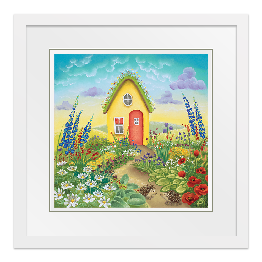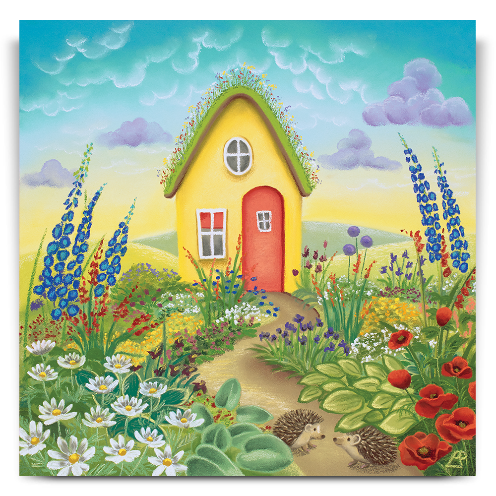 A cute, warm and inviting home set amongst a riot of brightly coloured flowers bursting with life. You can almost feel it’s positive aura. This is a happy home and with its cheerful colours, it makes the perfect sanctuary. Featuring two inquisitive hedgehogs.
