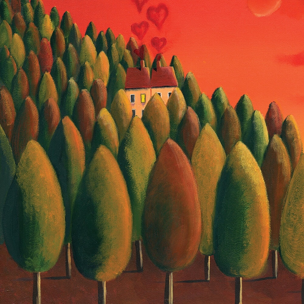 A heart warming scene of two houses together alone in the woods. In reality the two houses represent two people, sharing a moment