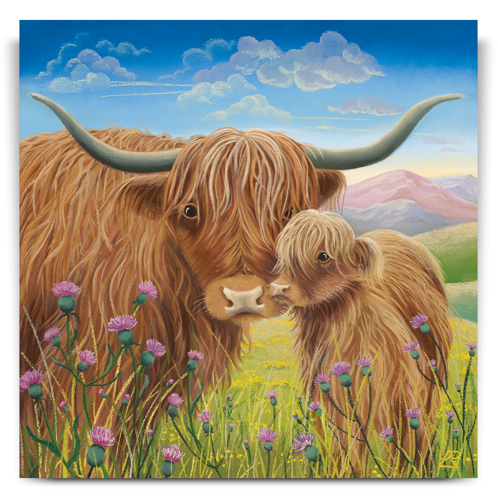 A beautiful depiction of Mother and Daughter in this stunning Highland Cow piece titled 'Heather and Thistle'.