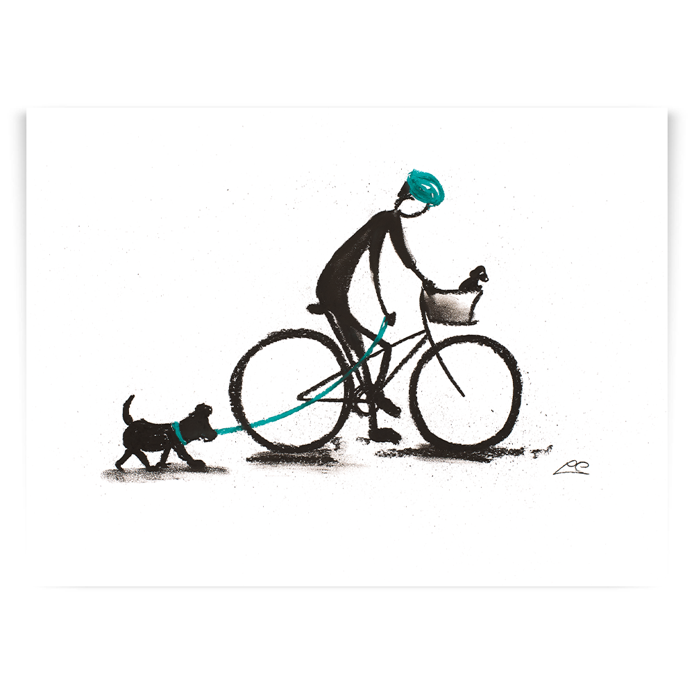 Playing boss in the front position, this little pup thinks he's in the driving seat! A relaxed image of a gentle bike ride, exercising two out of three!