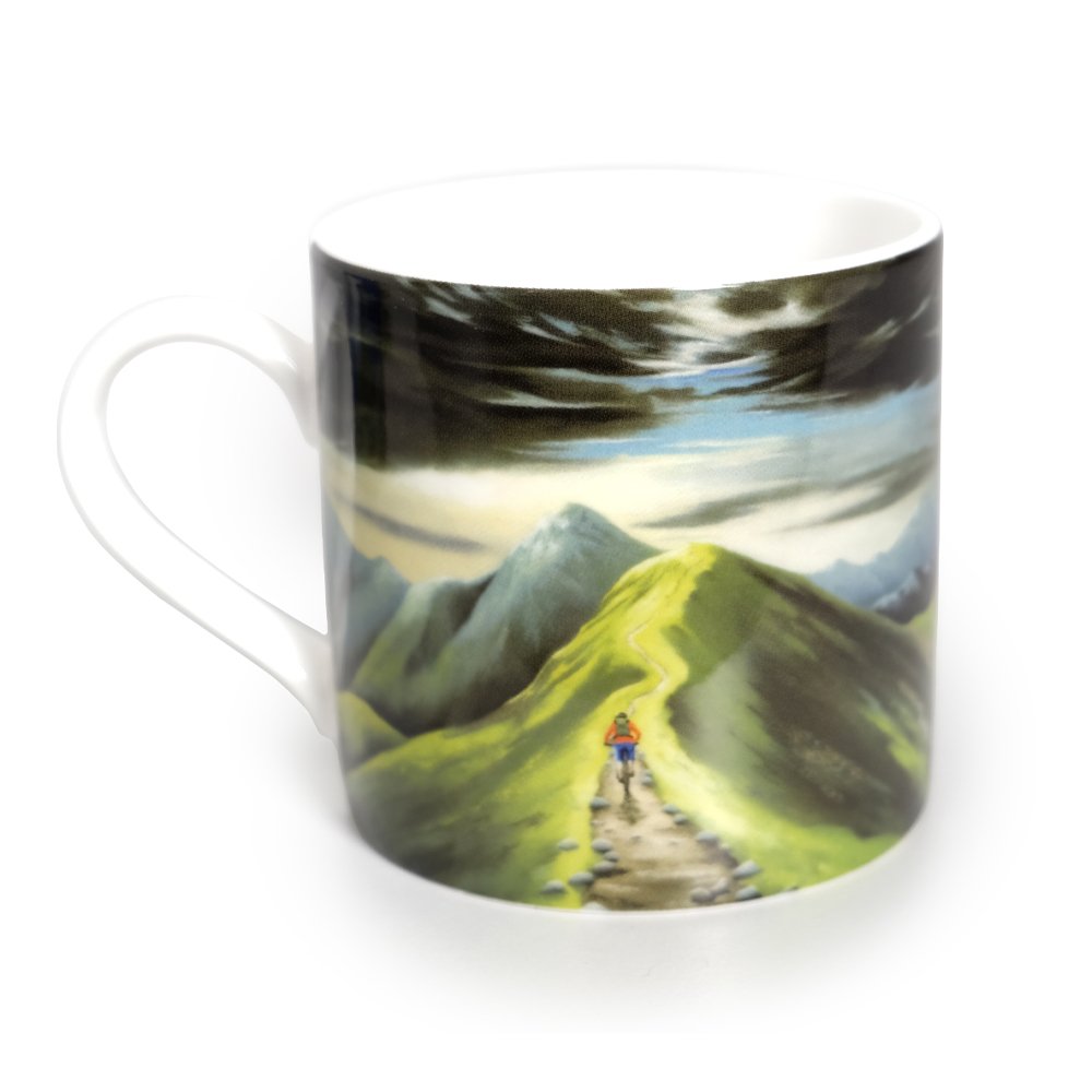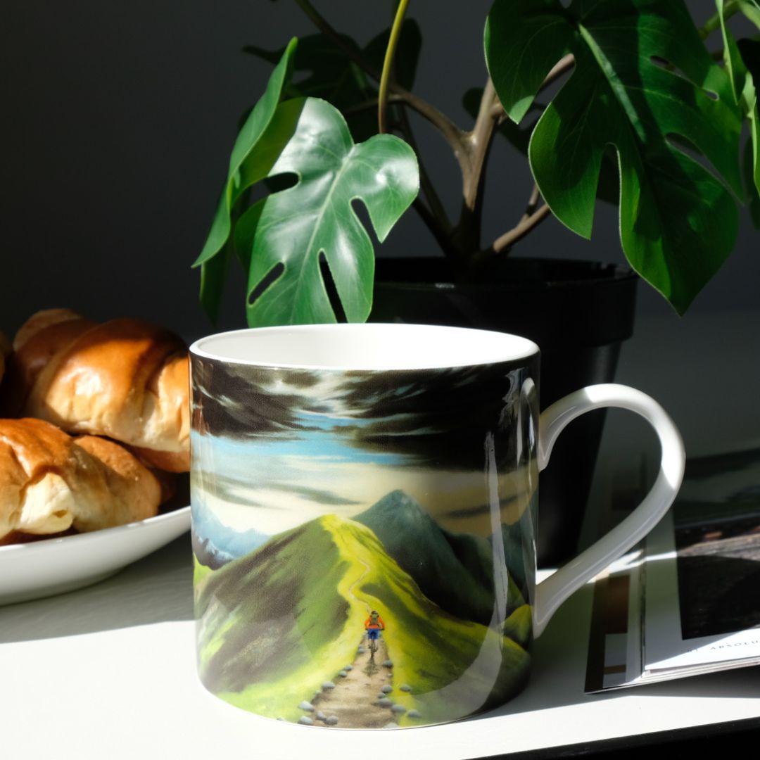 Embrace the serene beauty encapsulated in Lucy Pittaway's 'King of the Mountain' with our exquisite fine bone china mug. This exceptional piece depicts a cyclist journeying towards a mountain, set against a backdrop reminiscent of the Lake District, enriching your daily tea or coffee moments with a sense of adventure and tranquillity.
