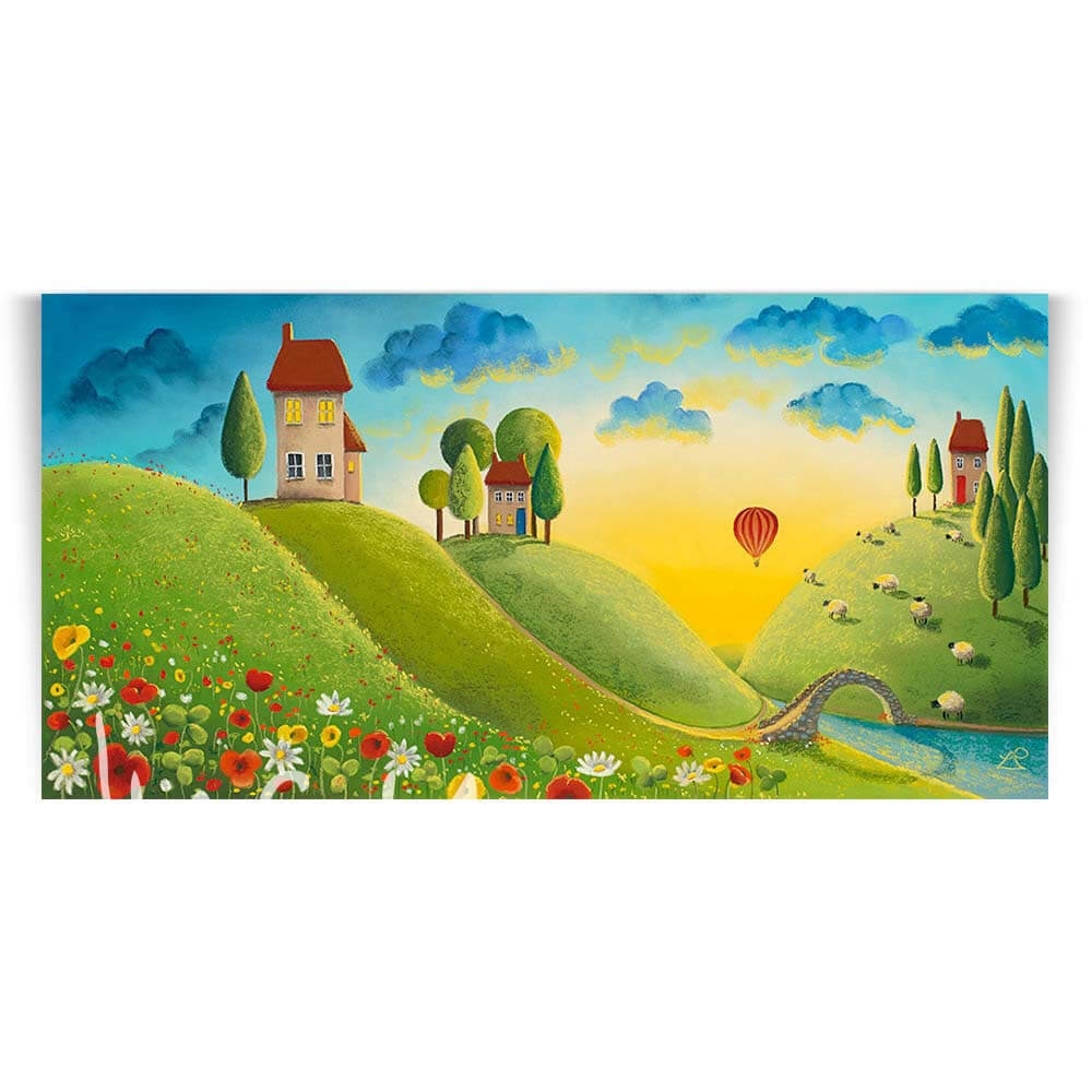A colourful array of flowers sits beneath the rolling hills, with their houses perched on top, perfectly placed for the best views. A little stone bridge over the water connects the community and allows the sheep to wander and graze. In the distance you can see a hot air balloon drifting off into the sunset.