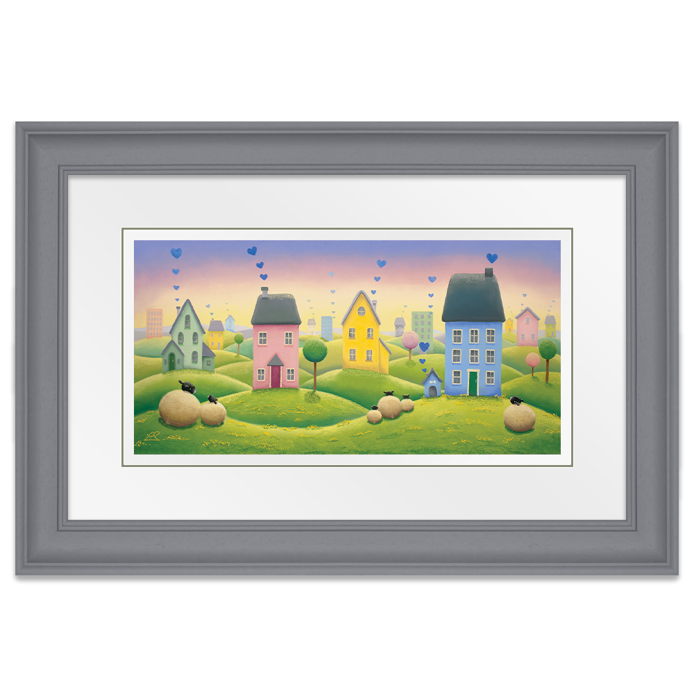 This painting is about love, thanks, and appreciation for our National Health Service with Blue hearts floating from homes of all shapes and sizes all across our land.
