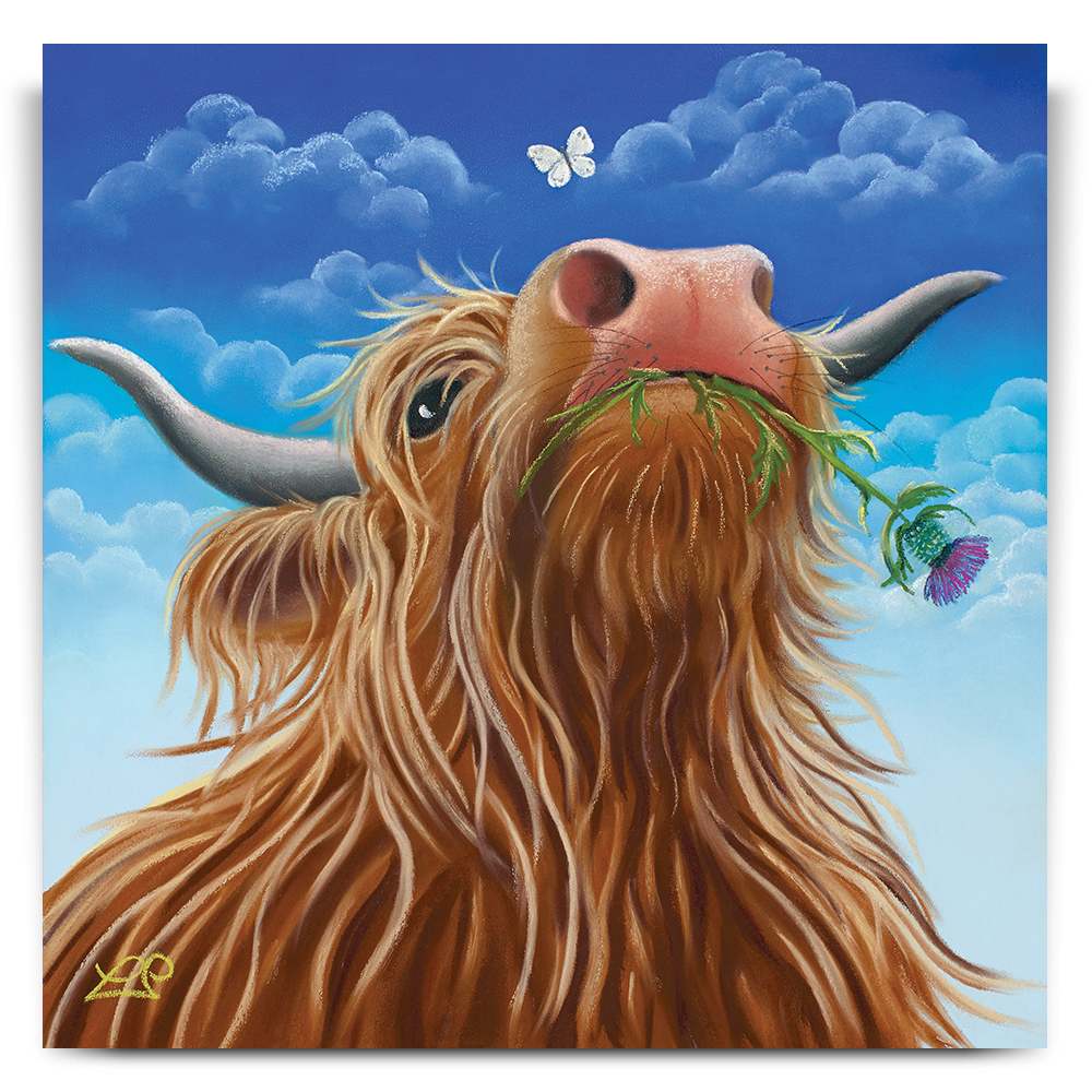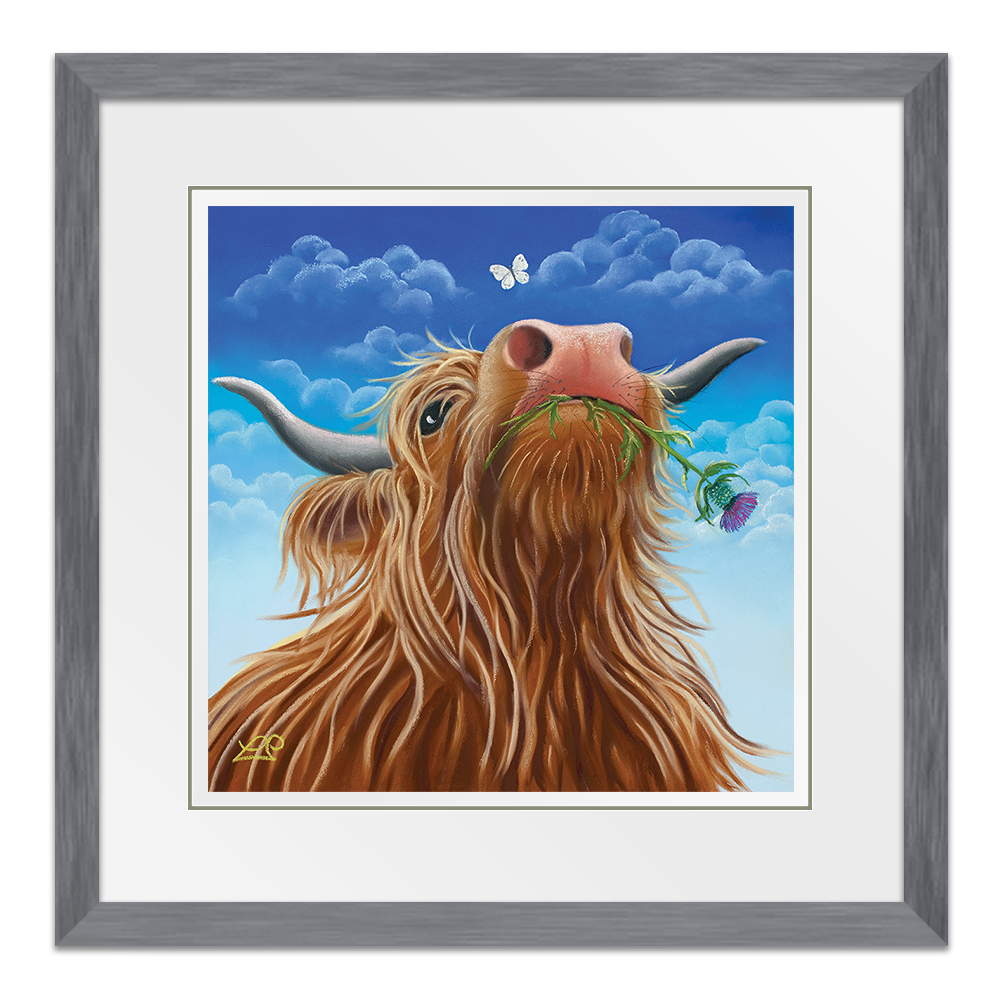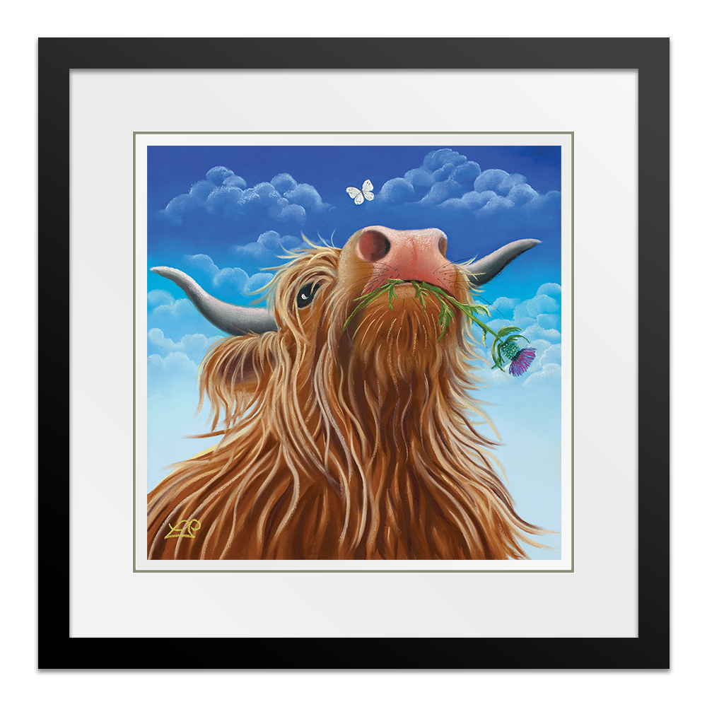 Crunching on a major thistle this majestic cow is wondering what disturbs his Sunday lunch! A daring butterfly comes almost a little too close to those large nostrils! A light hearted print with a touch of humour.