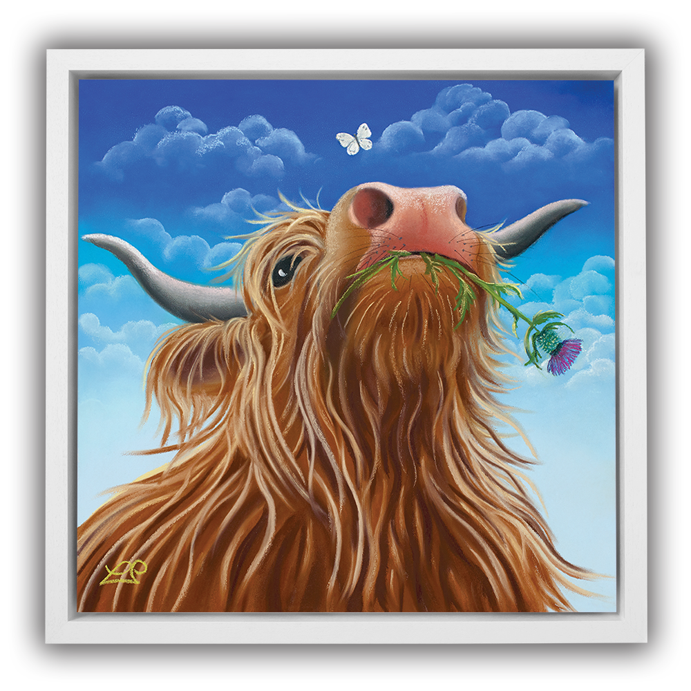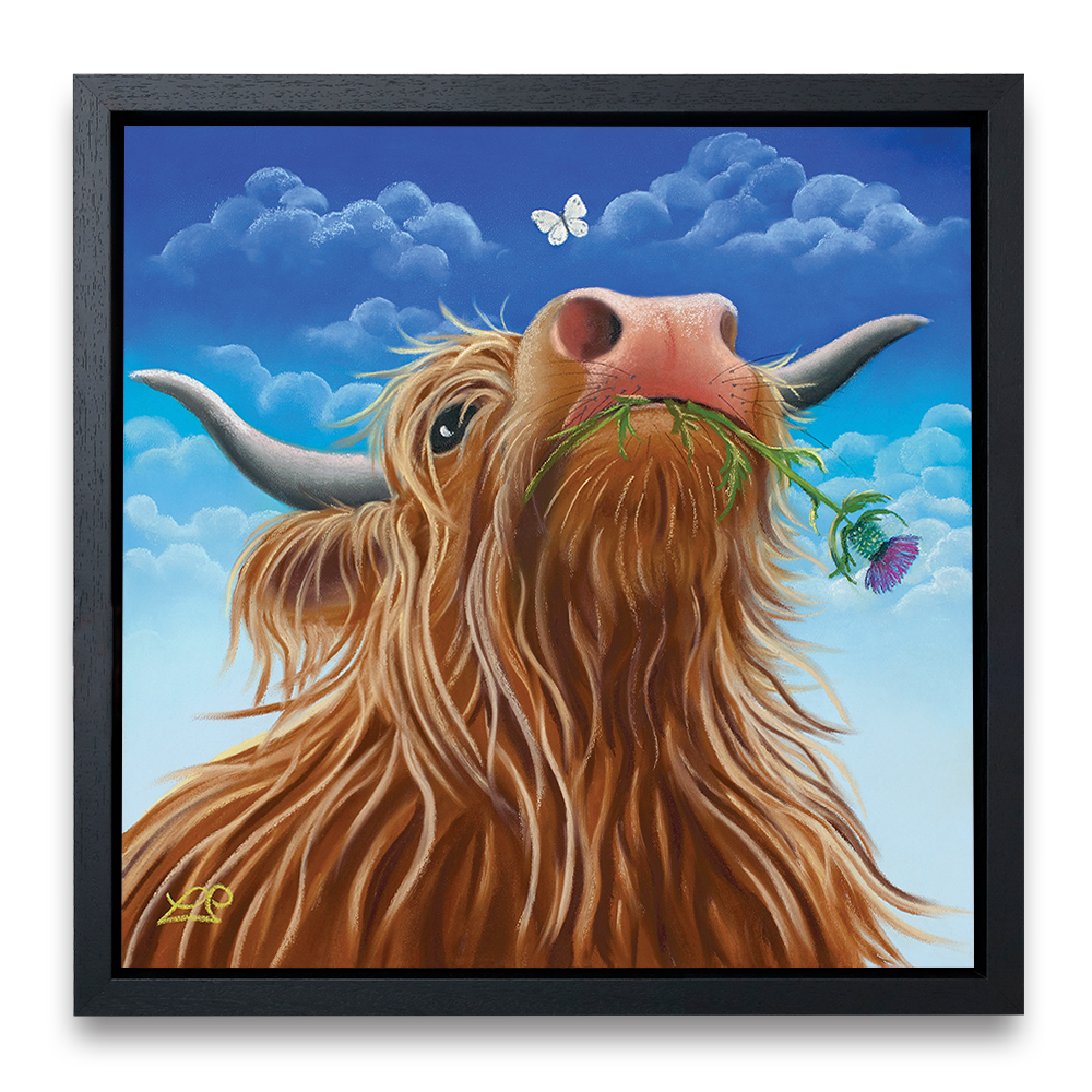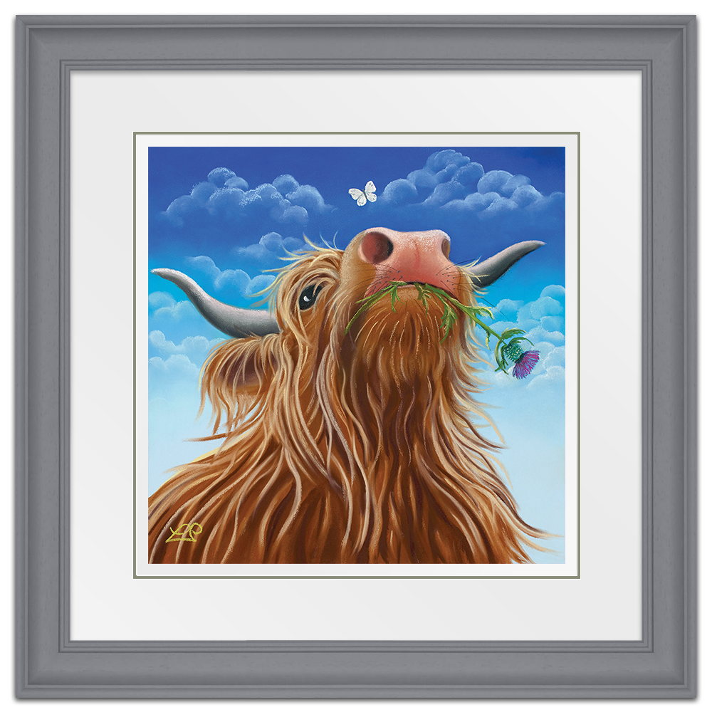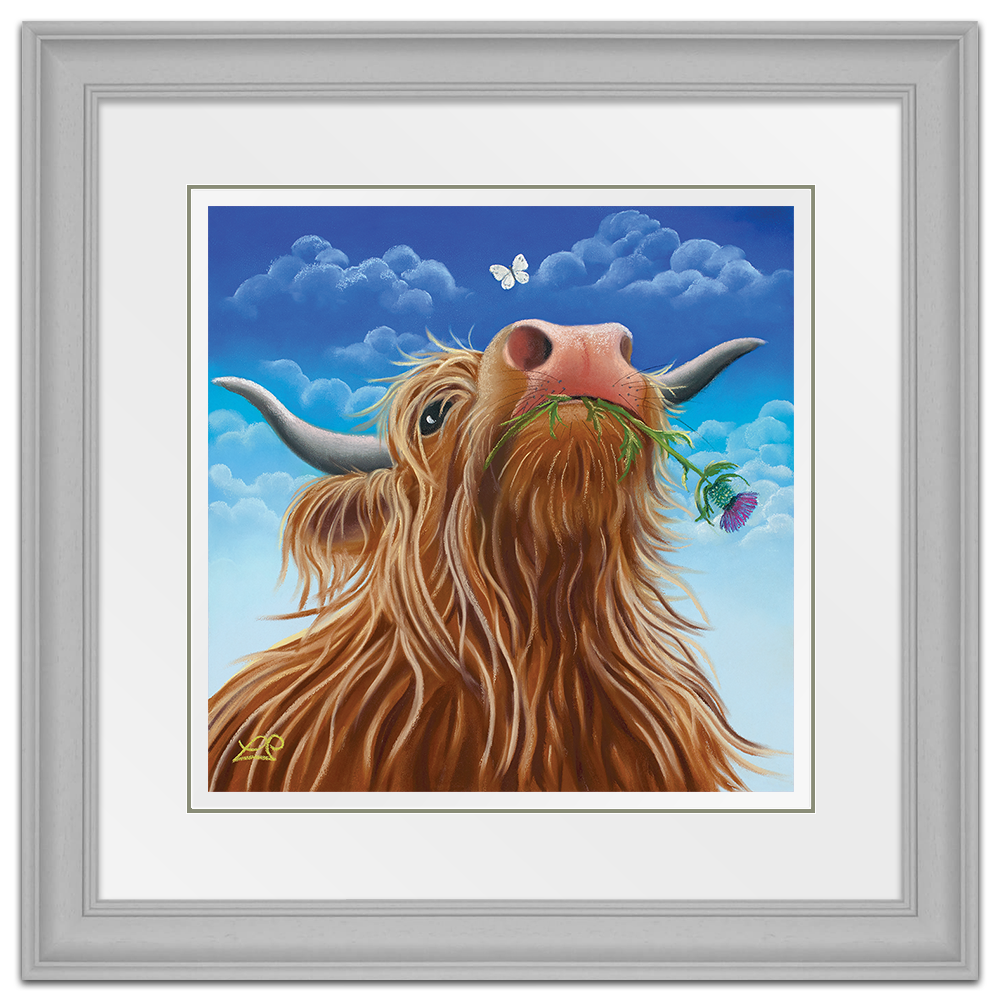 Crunching on a major thistle this majestic cow is wondering what disturbs his Sunday lunch! A daring butterfly comes almost a little too close to those large nostrils! A light hearted print with a touch of humour.