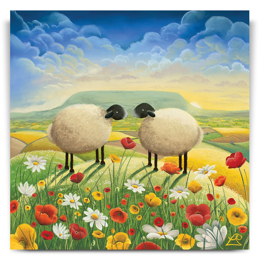It's early morning and the sun is rising slowly in the distance beyond Pen Hill, casting a warm yellow glow across Wensleydale in Yorkshire. Two sheep are meeting by the daisies and poppies, the perfect location to enjoy this stunning summer sunrise.