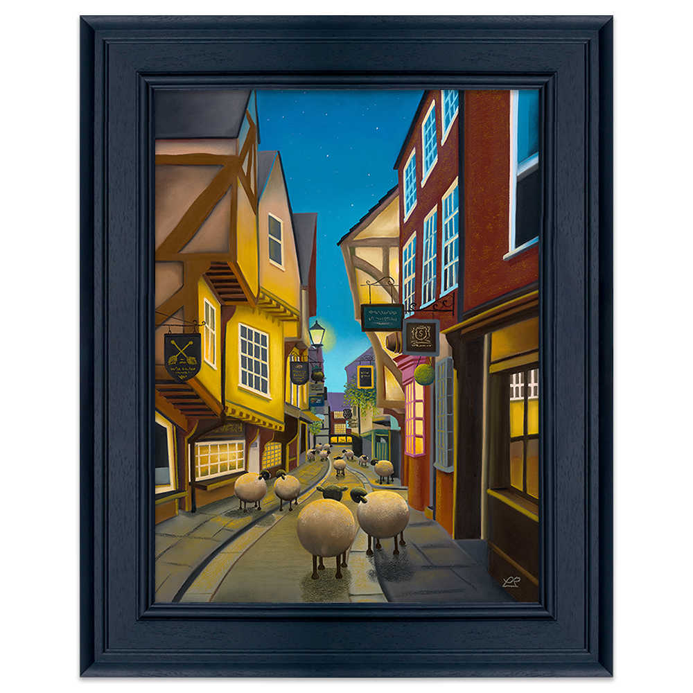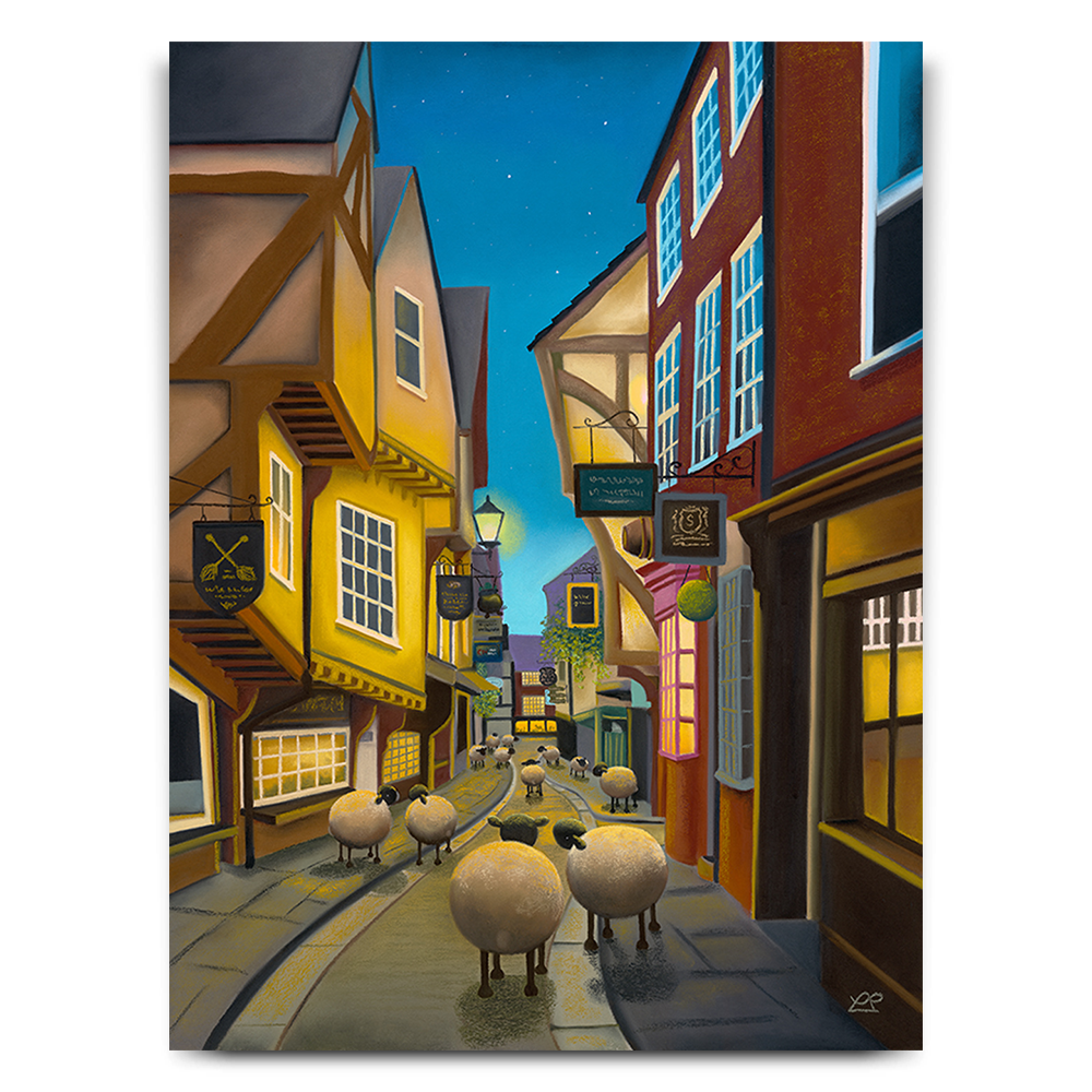 "Night on the Shambles" is an appealing artwork by Lucy Pittaway, featuring York's iconic Shambles with its medieval architecture under a beautiful blue sky. The title cleverly plays on the expression 'a night on the tiles,' adding a whimsical touch. Lucy's signature addition of sheep adds a delightful twist, showcasing her unique style. This piece is a departure from her usual subjects, making it a noteworthy addition that invites viewers to explore the magic of the Shambles through Lucy's creative interpretation.