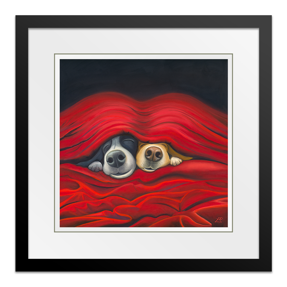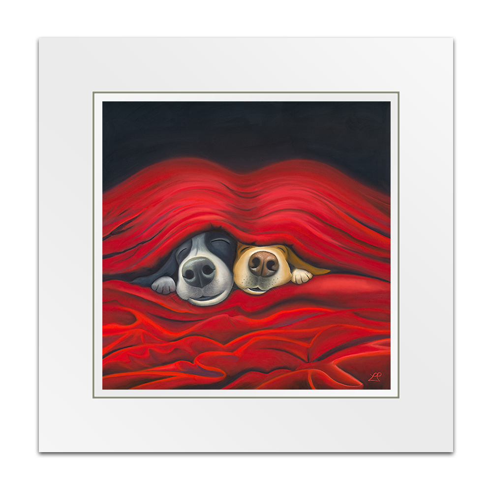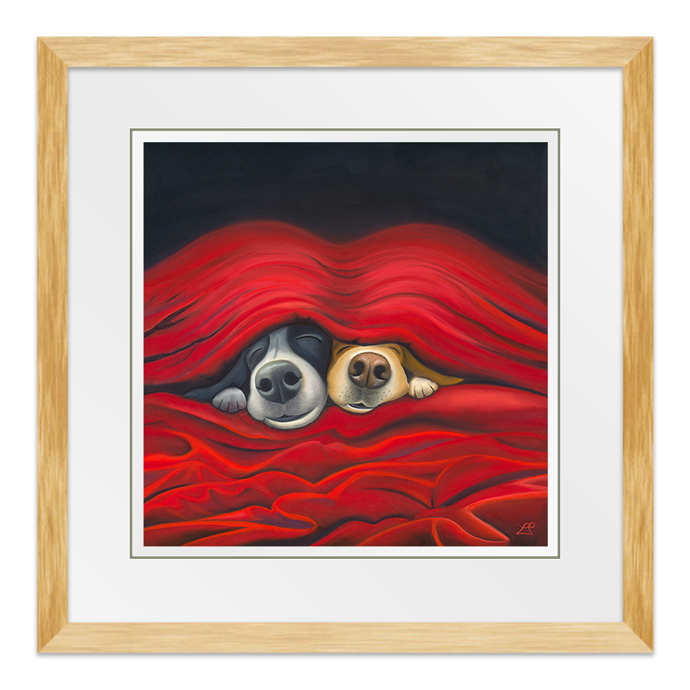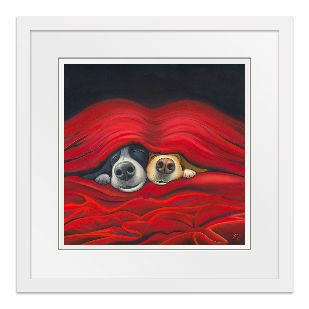 'Pawfect', captures the essence of pure love. Imagine two endearing dogs peeking out from under cosy sheets. They embody the simple joy of being close, perfectly made for each other. Their content faces expressing the happiness found in each other's company, with smiles that speak volumes.