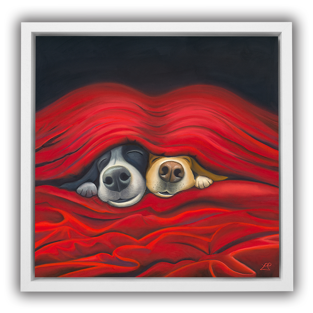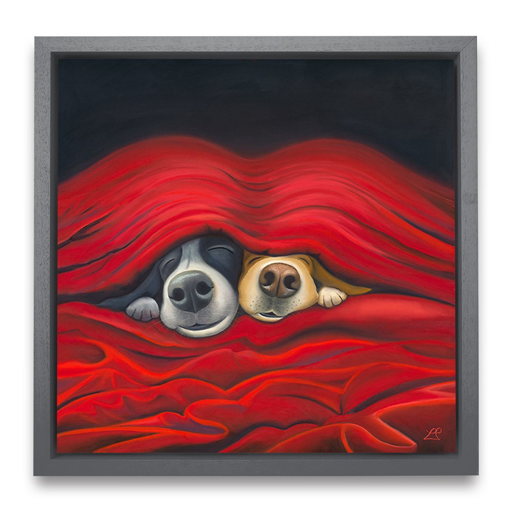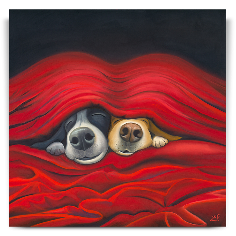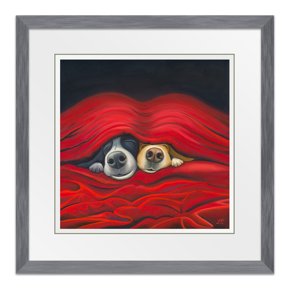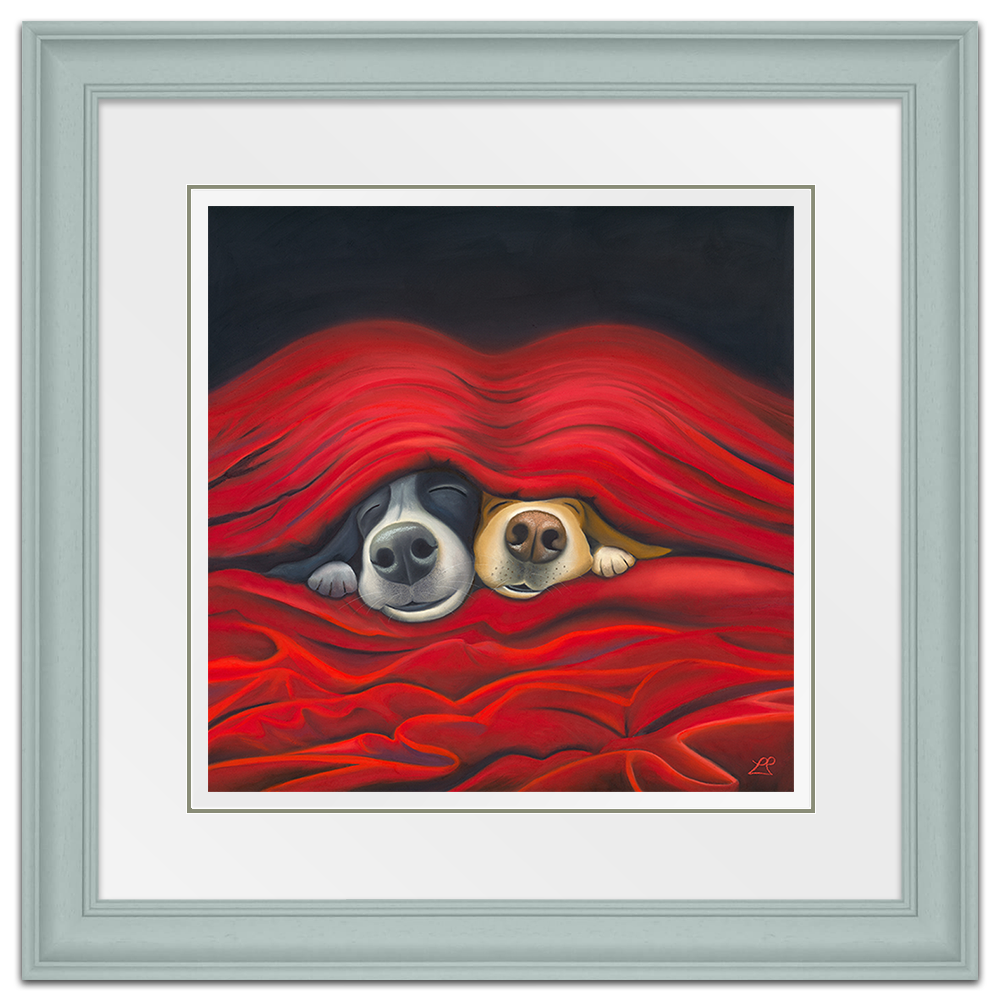 'Pawfect', captures the essence of pure love. Imagine two endearing dogs peeking out from under cosy sheets. They embody the simple joy of being close, perfectly made for each other. Their content faces expressing the happiness found in each other's company, with smiles that speak volumes.