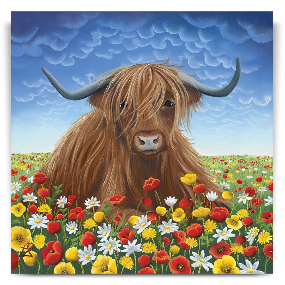 A Highland cow sits peacefully amidst a blanket of colourful wild flowers. Solitude is all that is wanted in this moment, to enjoy the wonder around her.