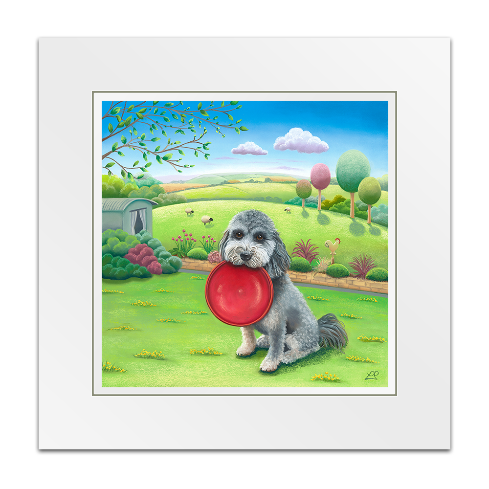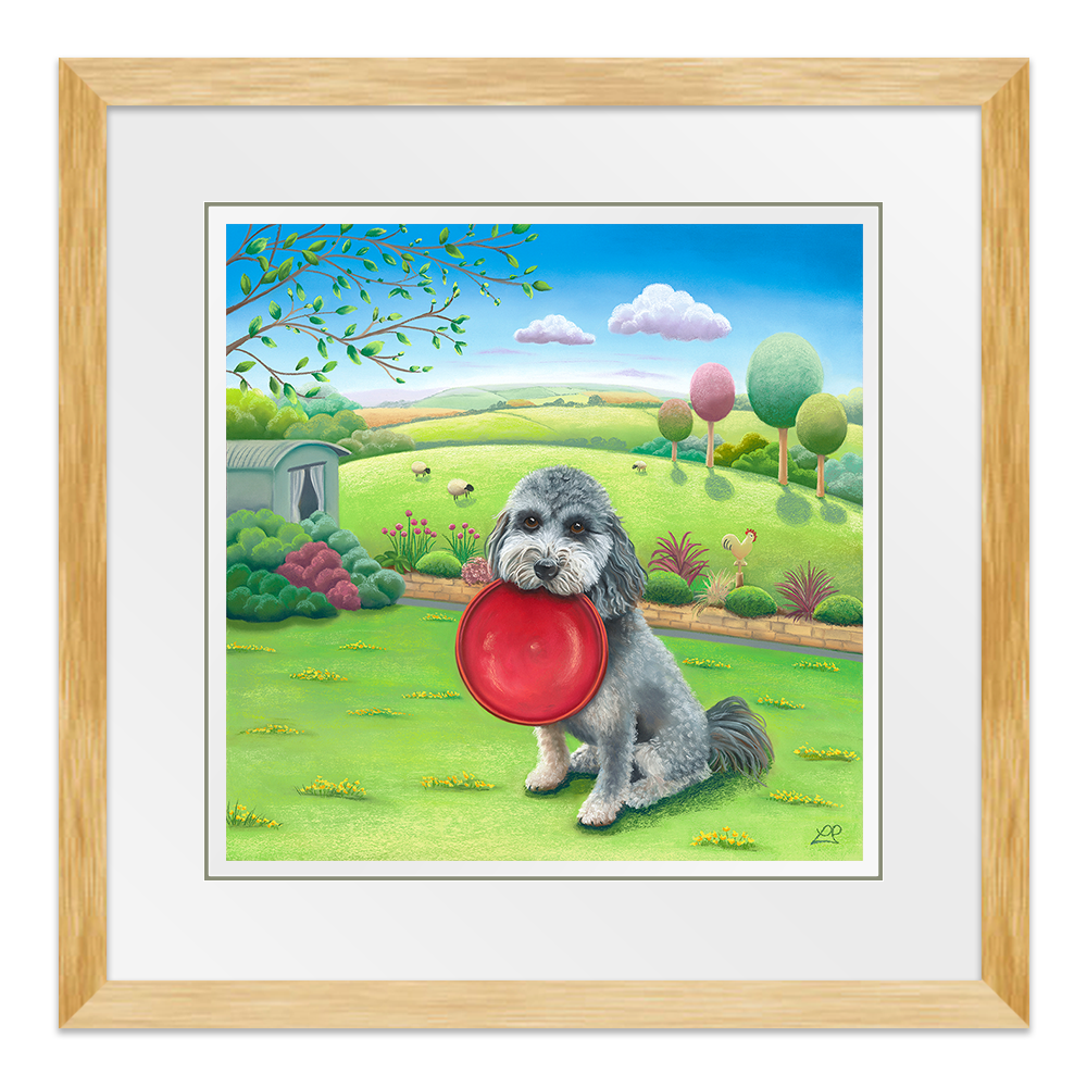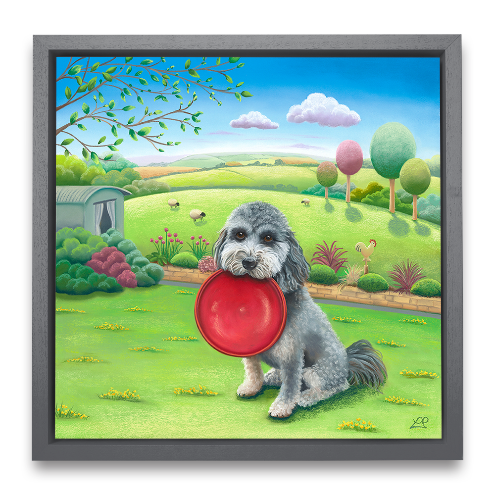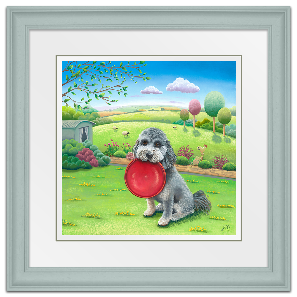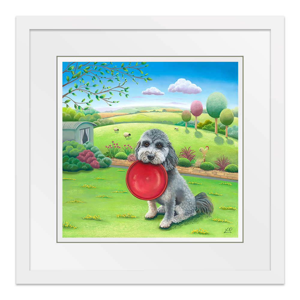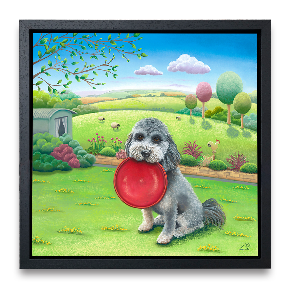 Meet Stanley — a cheeky cockapoo who loves nothing more than chasing his red frisbee across the garden. Surrounded by countryside and a few familiar sheep in the distance, this piece captures that familiar look of playfulness every dog owner will recognise. A great addition for anyone who loves dogs, art, and the outdoors.