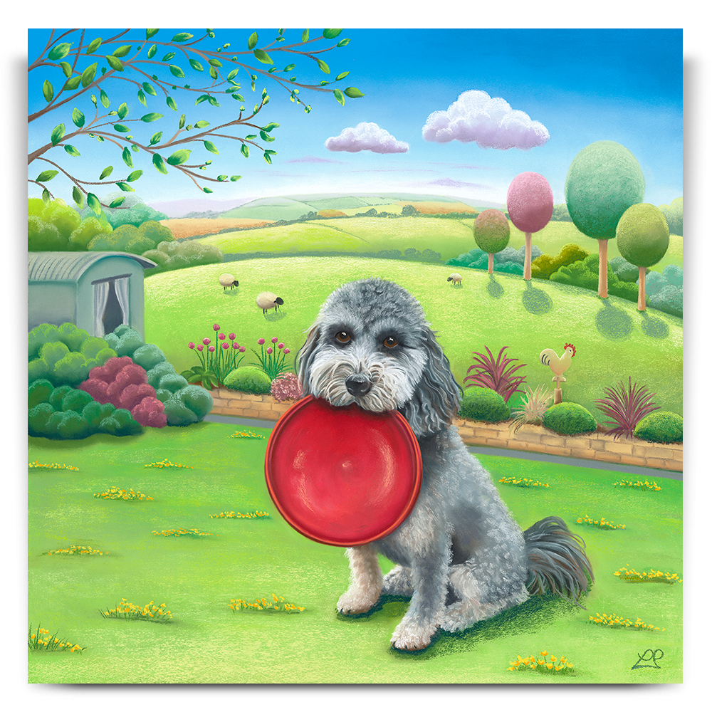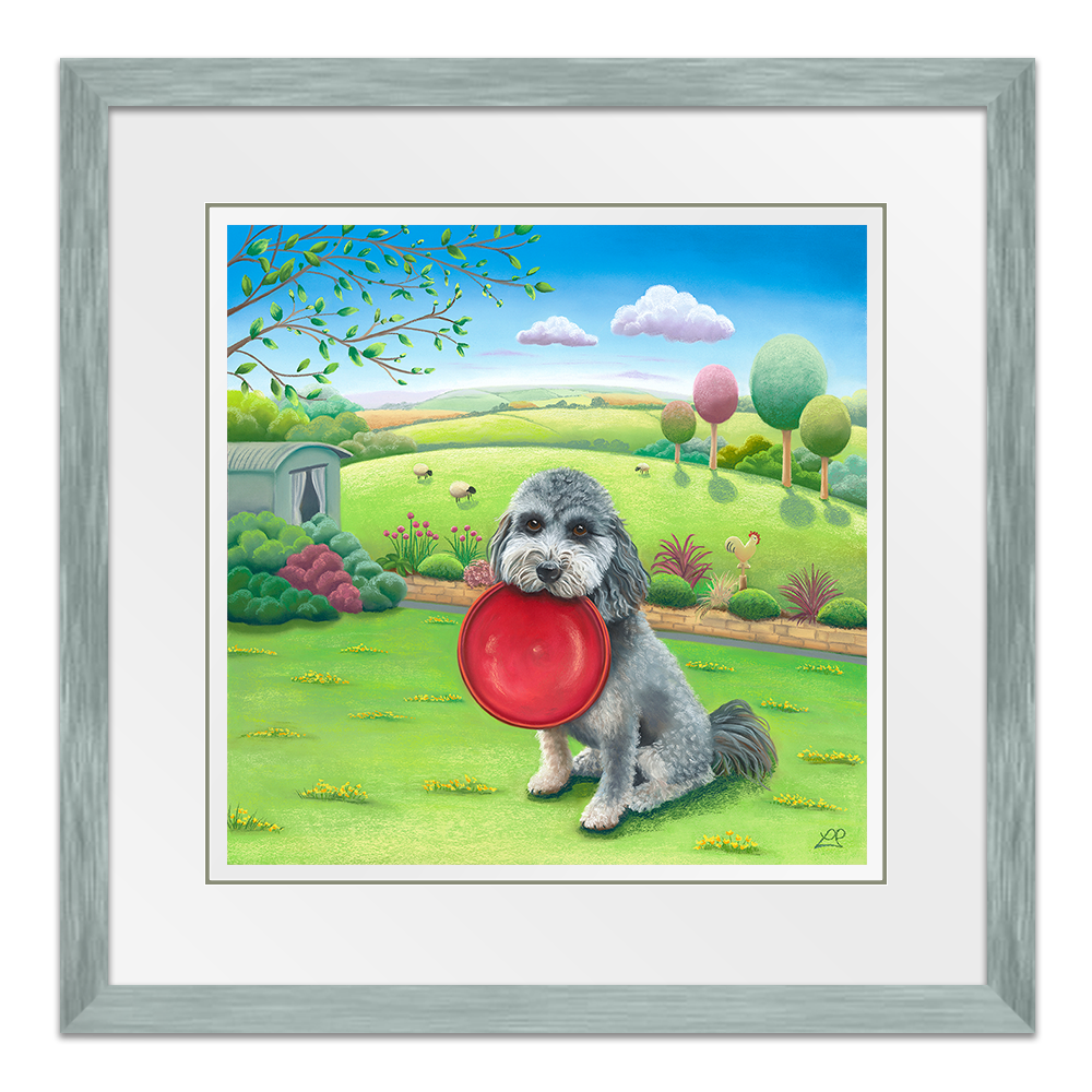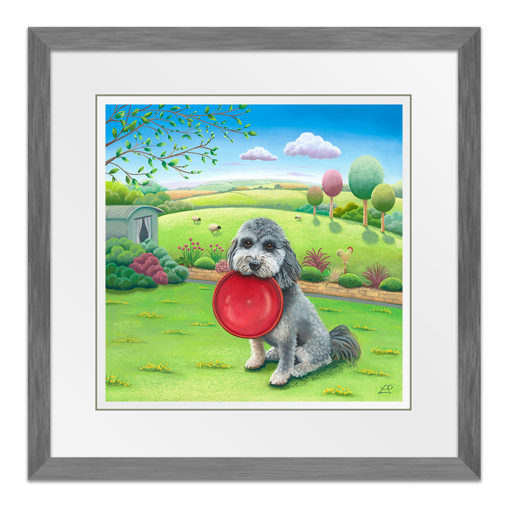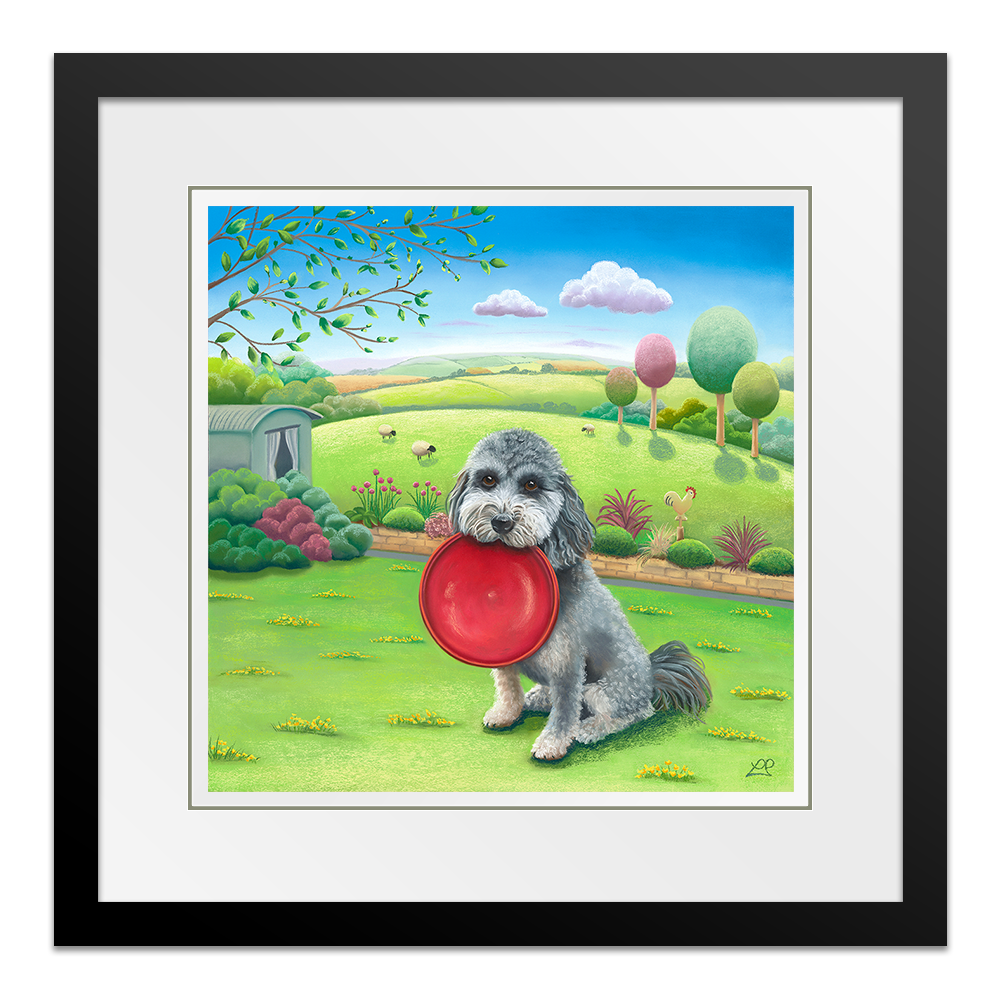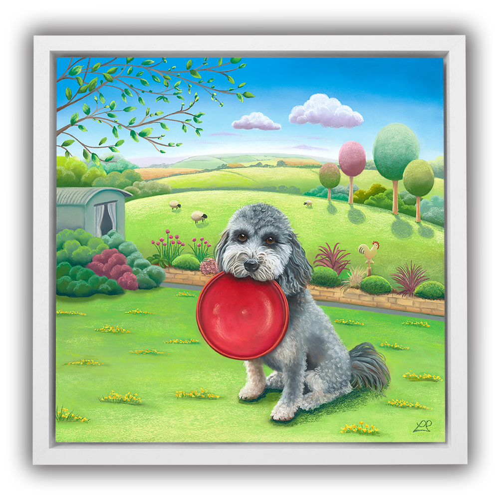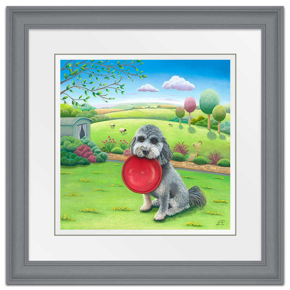 Meet Stanley — a cheeky cockapoo who loves nothing more than chasing his red frisbee across the garden. Surrounded by countryside and a few familiar sheep in the distance, this piece captures that familiar look of playfulness every dog owner will recognise. A great addition for anyone who loves dogs, art, and the outdoors.