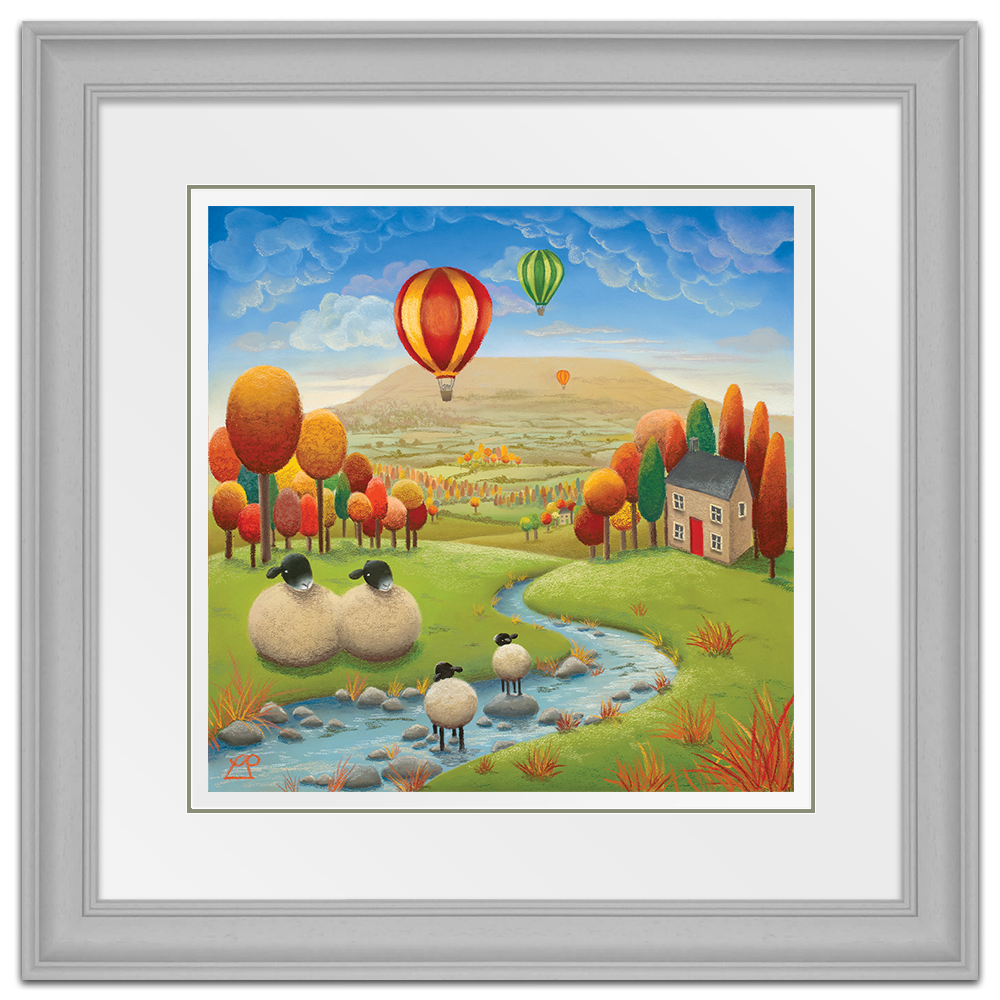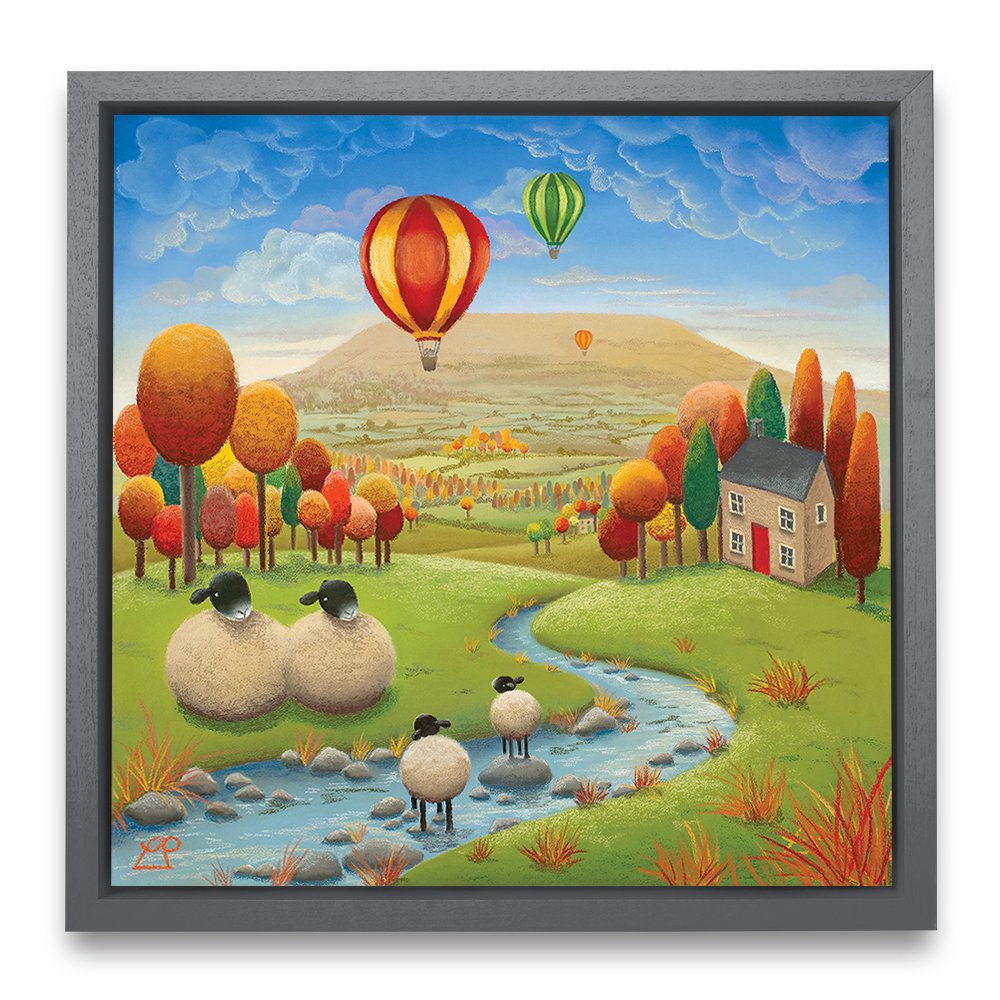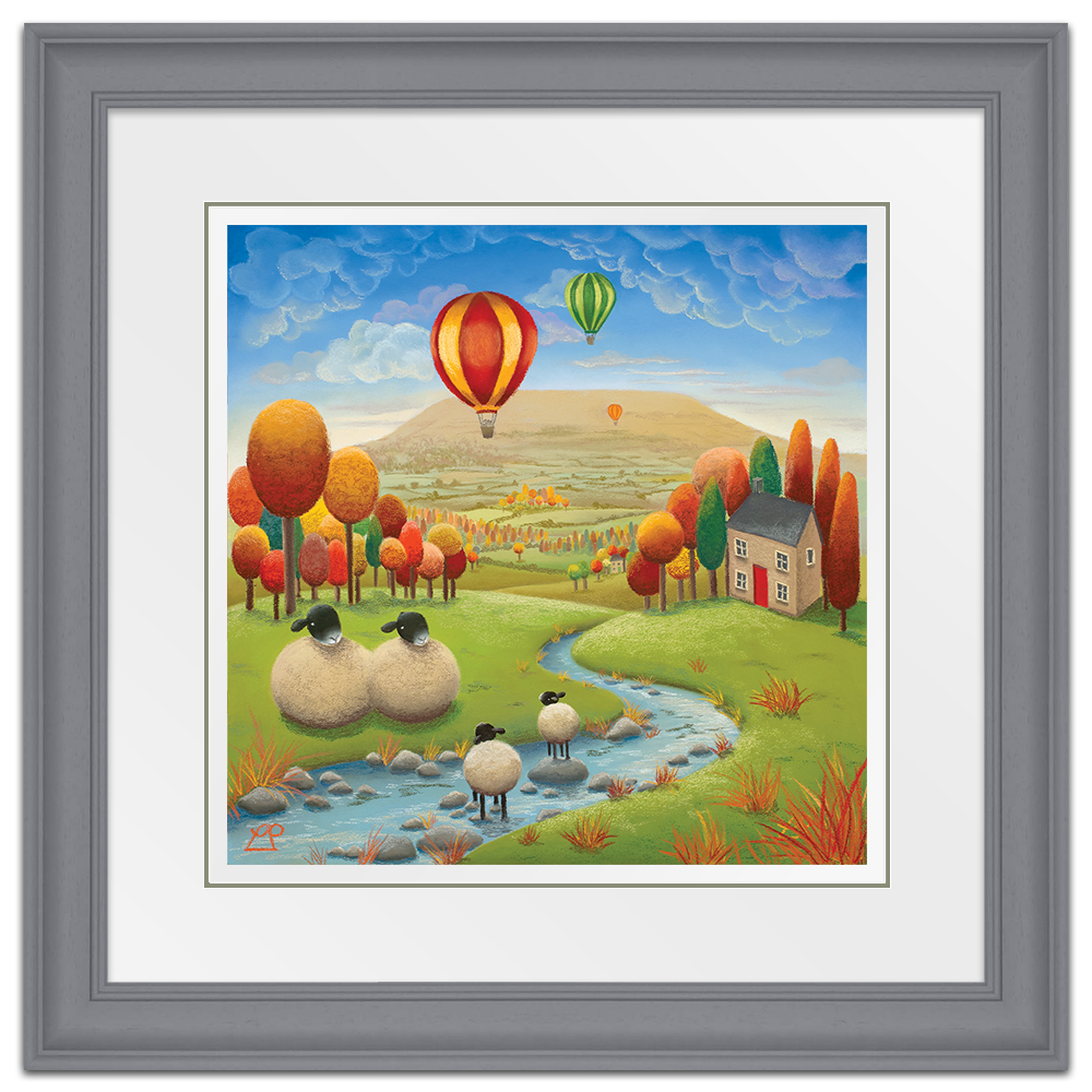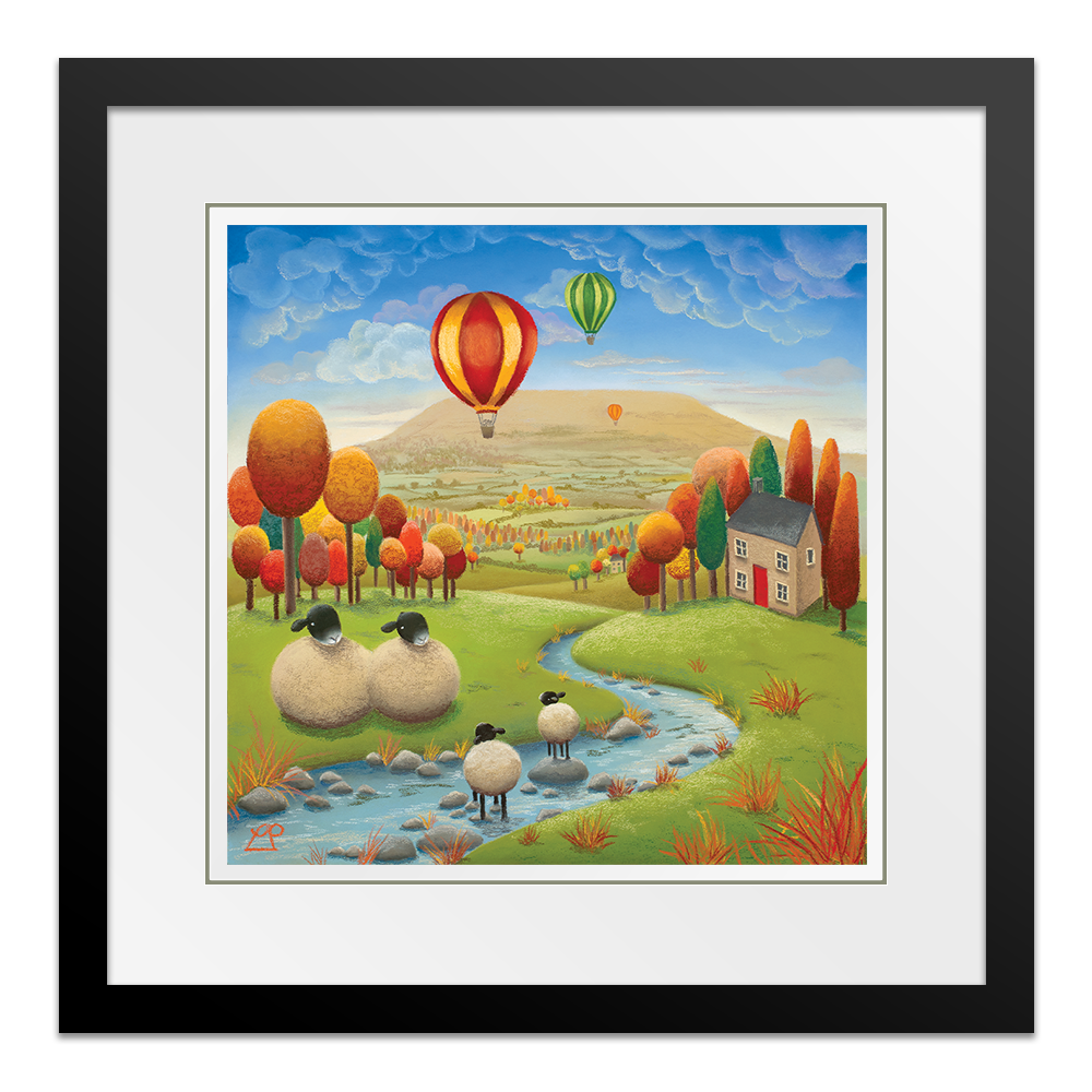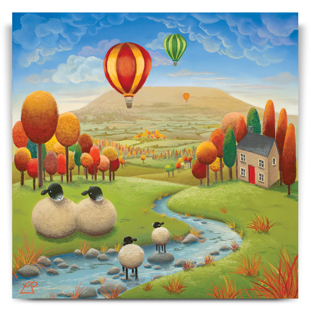 'Stepping Stones' is a bright and colourful painting depicting two lambs playing in the stream under the watchful eye of their parents with striking hot air balloons in a deep blue sky. The stunning Yorkshire Dales, particularly Penhill in Wensleydale, were my inspiration for this piece and my family have spent many hours on days like this, enjoying the simple pleasures of life in the countryside.