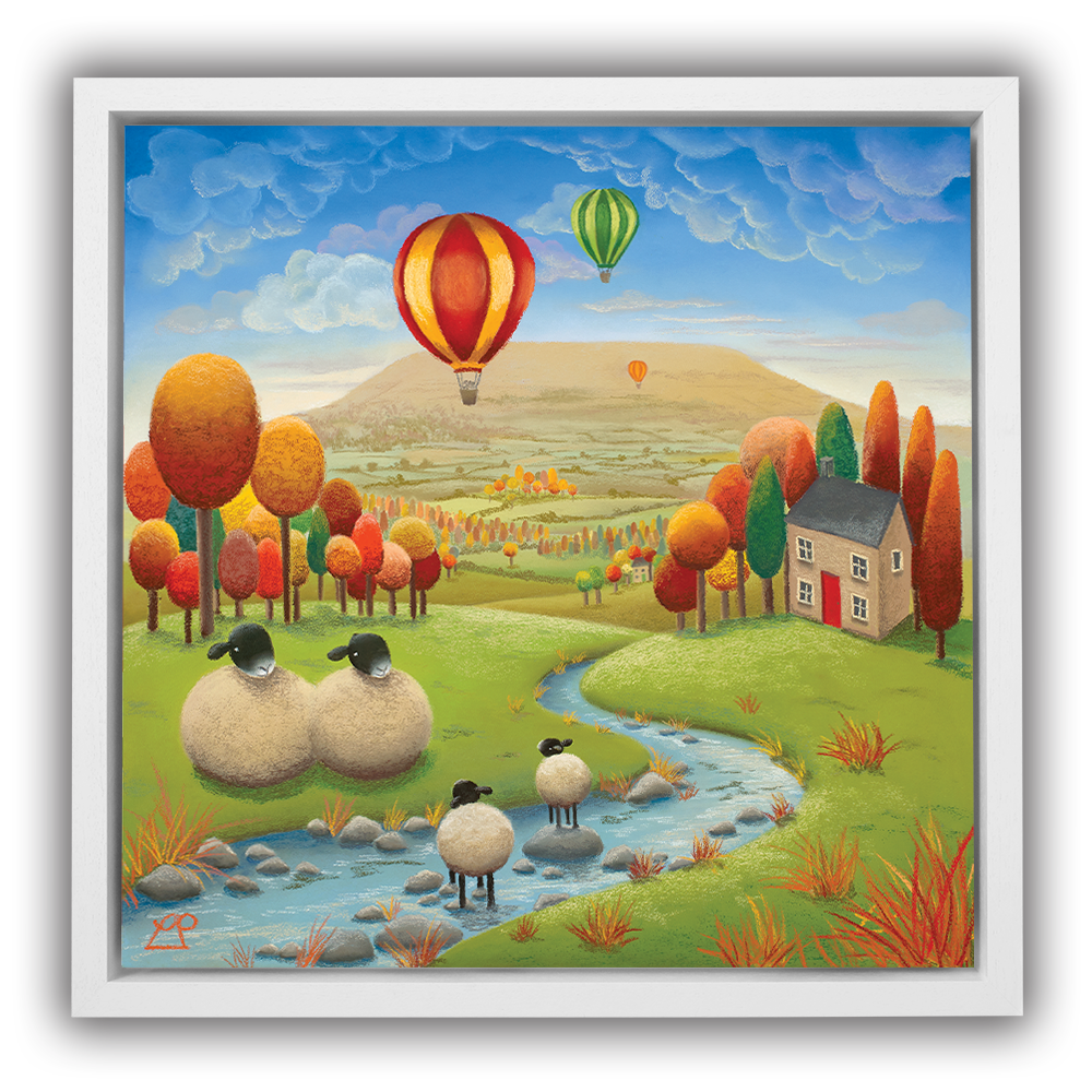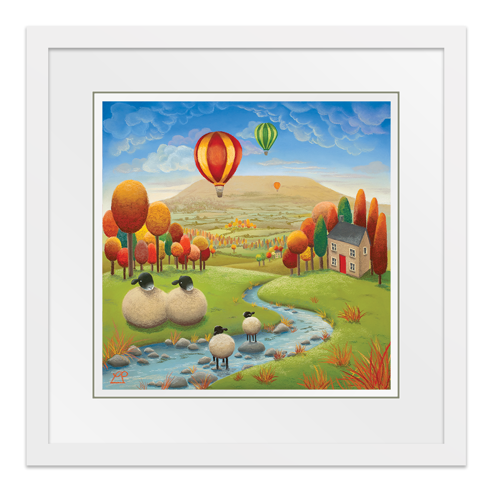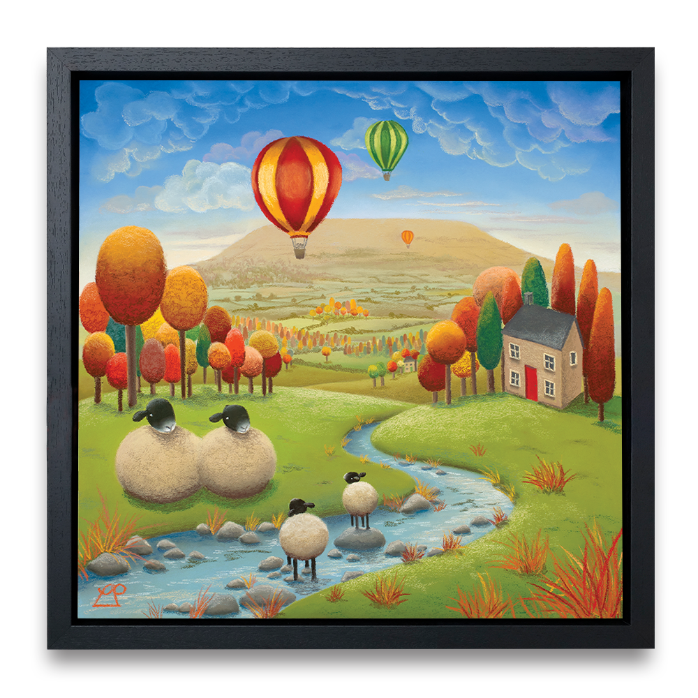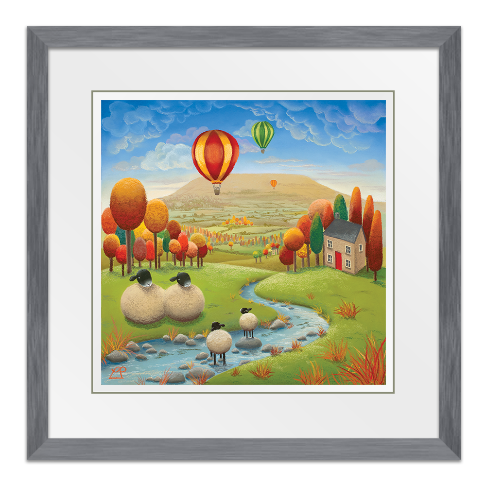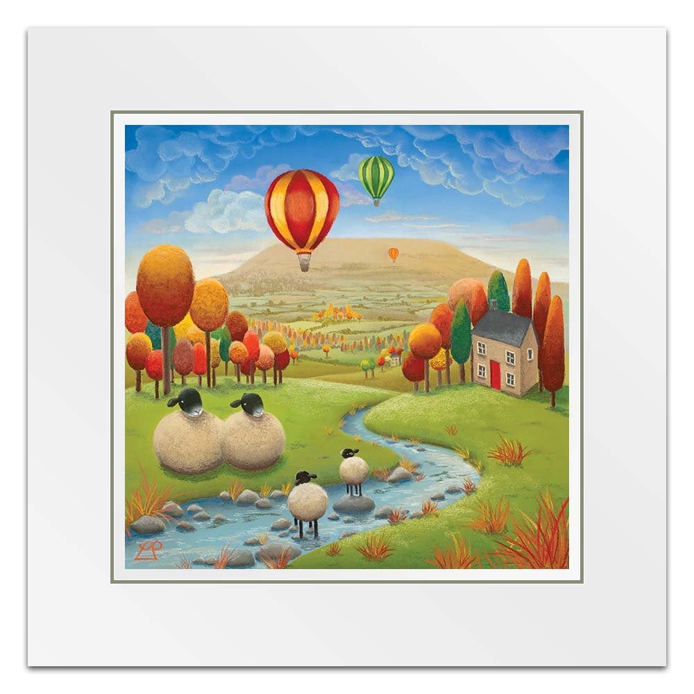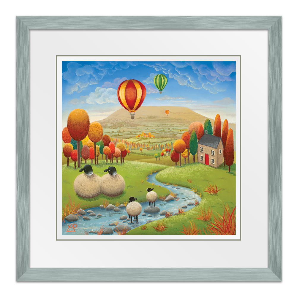 'Stepping Stones' is a bright and colourful painting depicting two lambs playing in the stream under the watchful eye of their parents with striking hot air balloons in a deep blue sky. The stunning Yorkshire Dales, particularly Penhill in Wensleydale, were my inspiration for this piece and my family have spent many hours on days like this, enjoying the simple pleasures of life in the countryside.