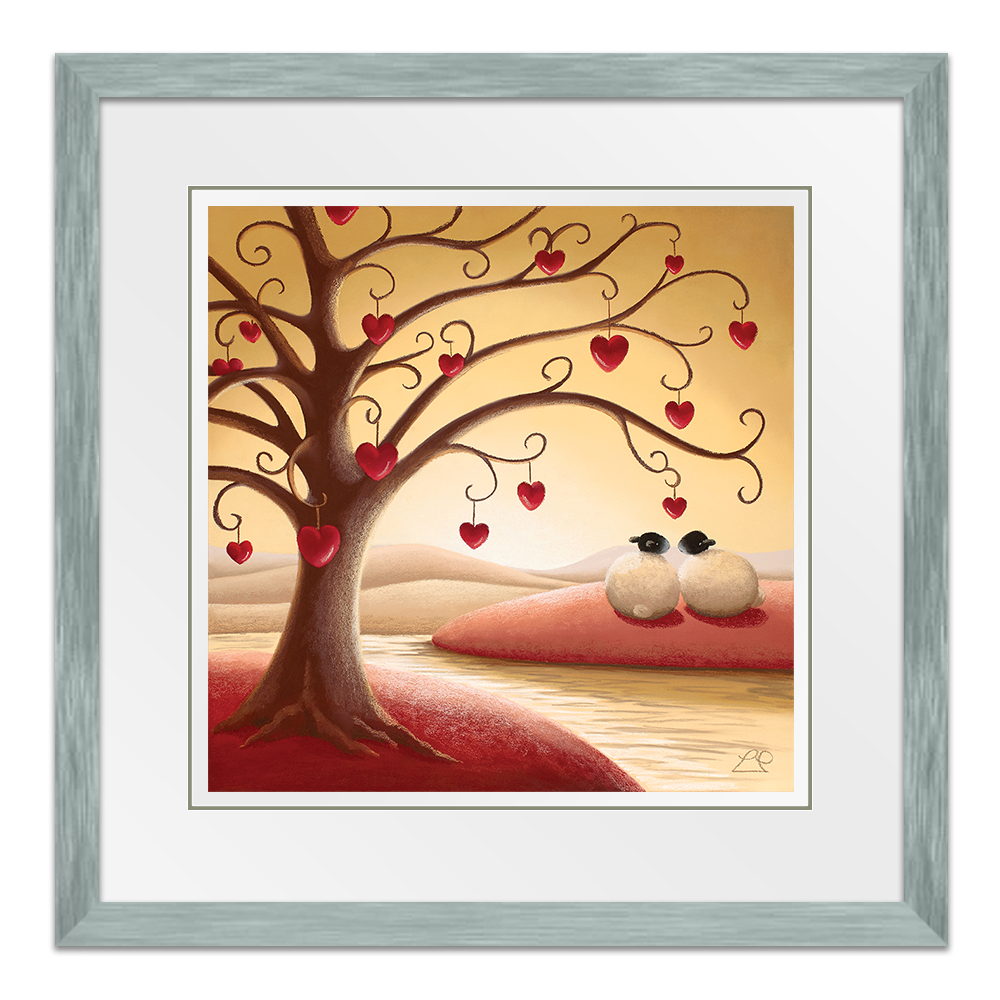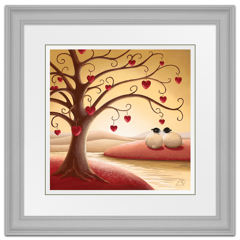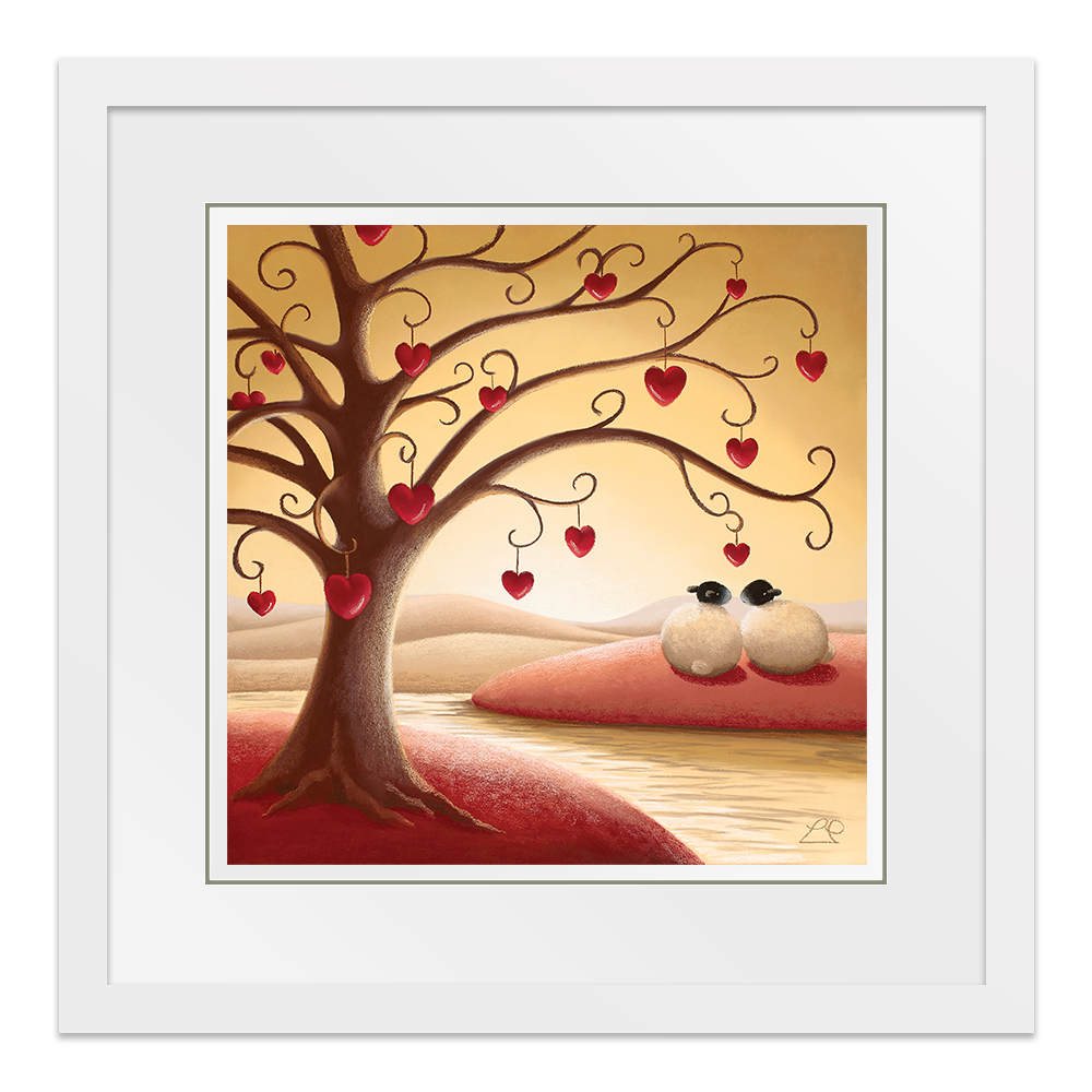 'Under The Tree Of Love' nestles a couple that only have eyes for each other. from Lucy Pittaway's Sheep Art collection, the perfect piece of artwork to say 'I love you'.