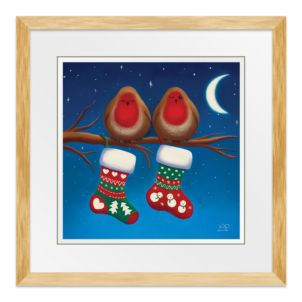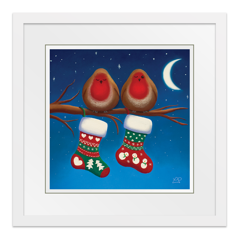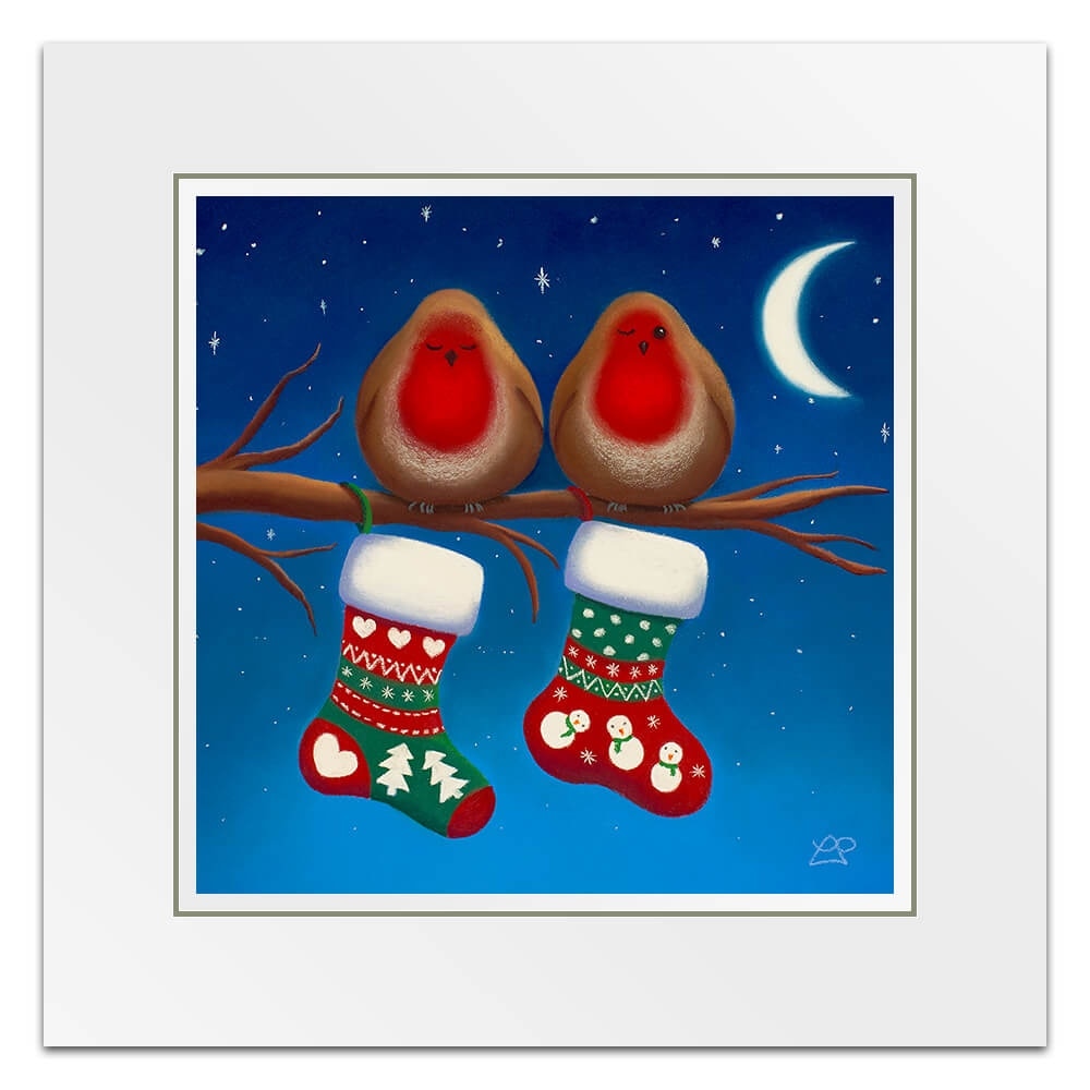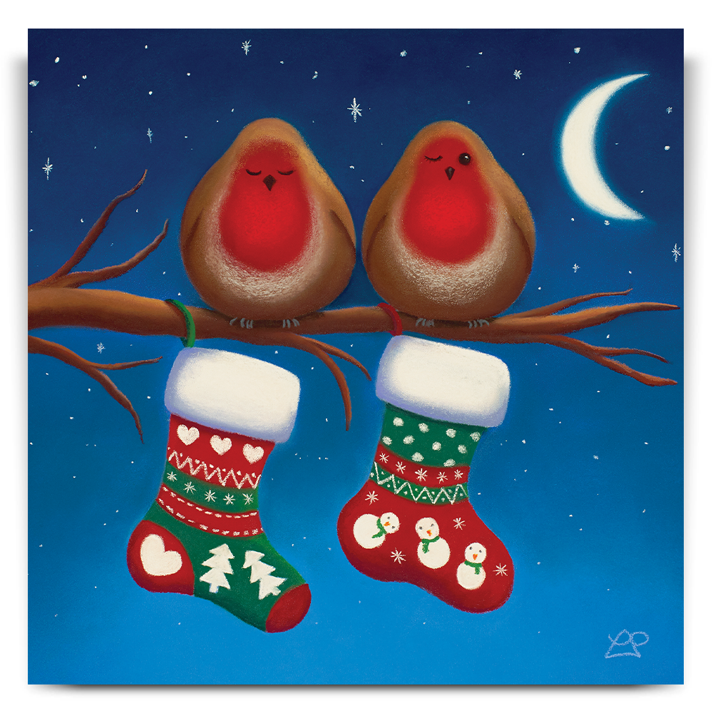 Two little expectant Robins are sat waiting for a special delivery. One is keeping an eye on the stockings, watching out for Santa. Have they been good enough for their stockings to be full of prezzies by the morning I wonder?