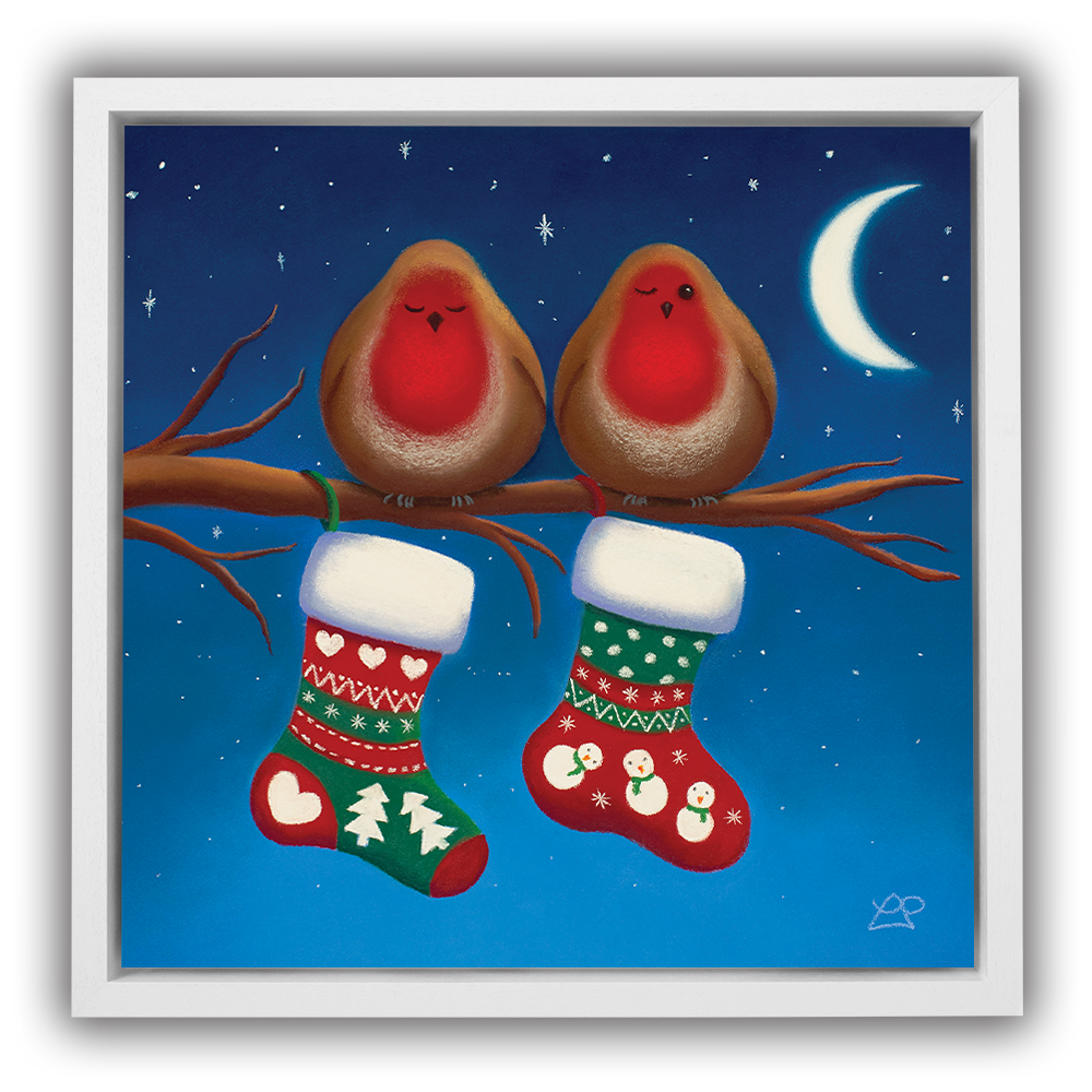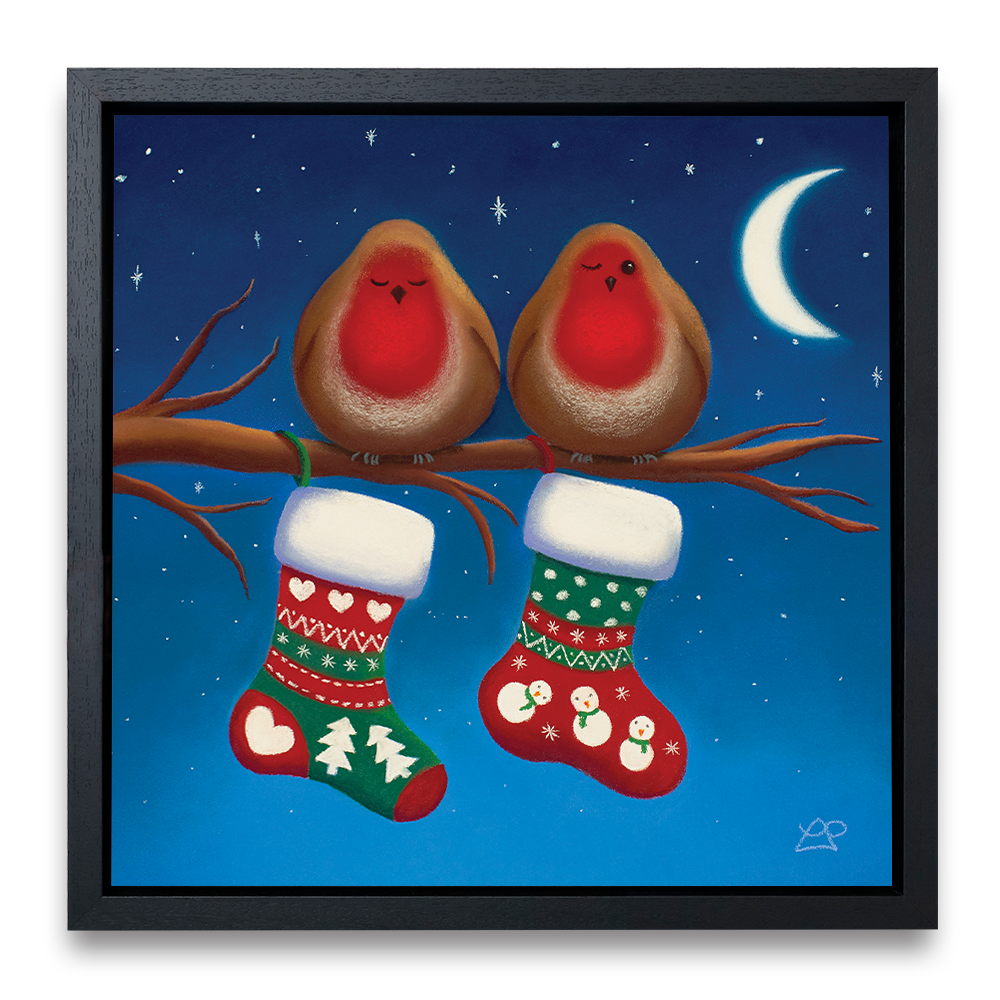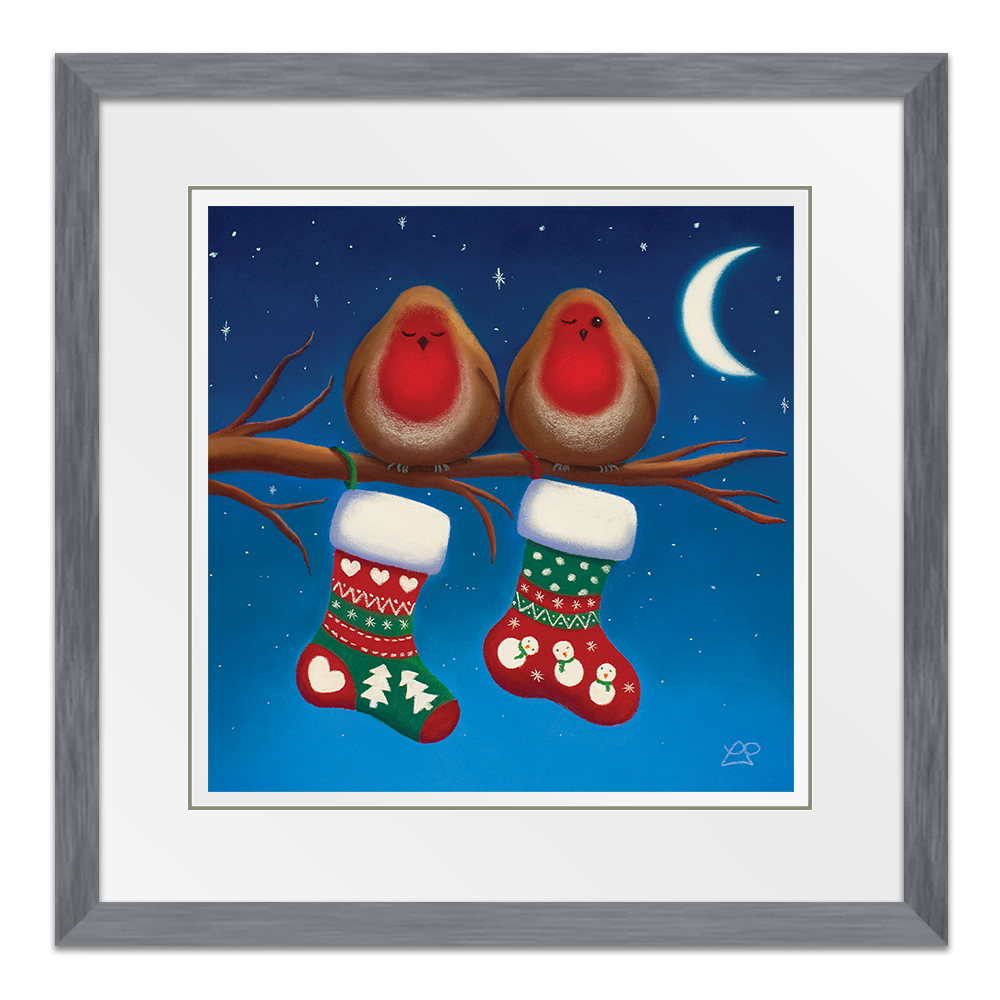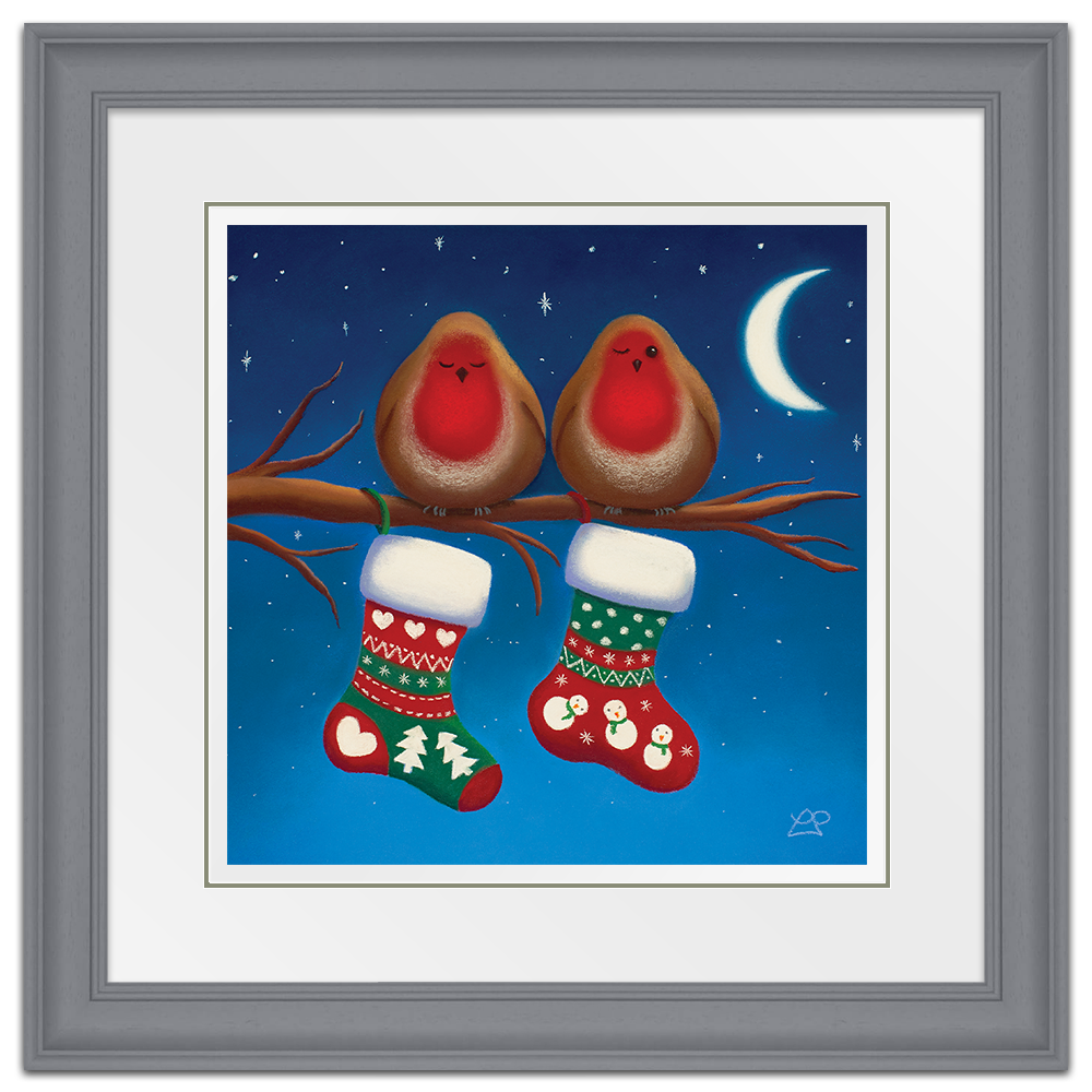 Two little expectant Robins are sat waiting for a special delivery. One is keeping an eye on the stockings, watching out for Santa. Have they been good enough for their stockings to be full of prezzies by the morning I wonder?