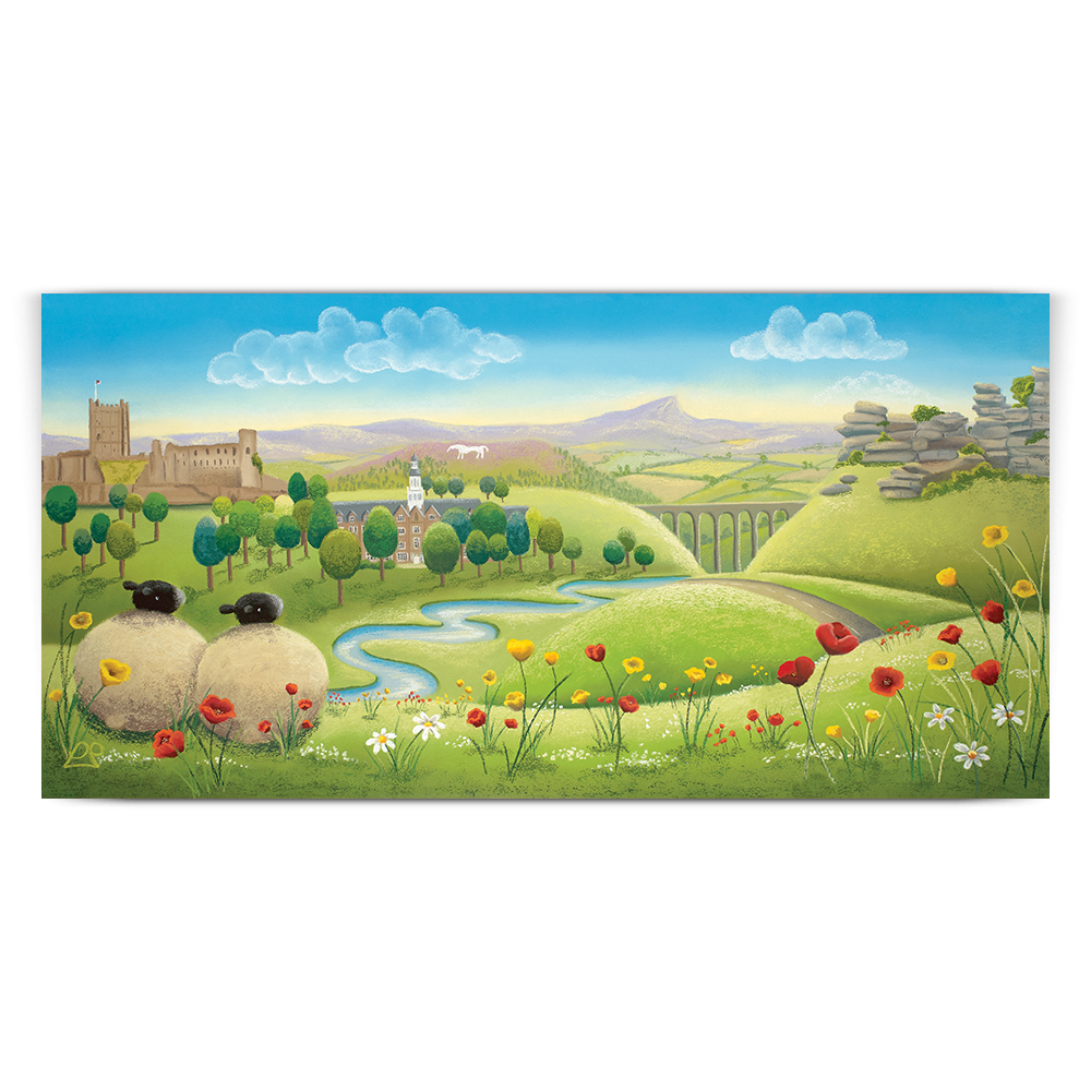 From Barnard Castle to Brimham Rocks, this piece takes in the River Swale, Barnard Castle School with its famous 'Pepper Pot Tower'; visible from far and wide across the local landscape, the White Horse in Cleveland and Ribblehead viaduct. Created as a special commission.