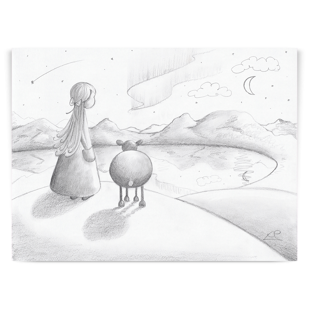 Original signed sketch drawing by Lucy Pittaway 'Gazing at the amazing scene before her, Little Lucy and her trusted friends stand before the world in all its night-time glory, awe-struck by its beauty.